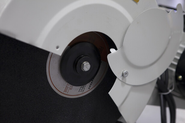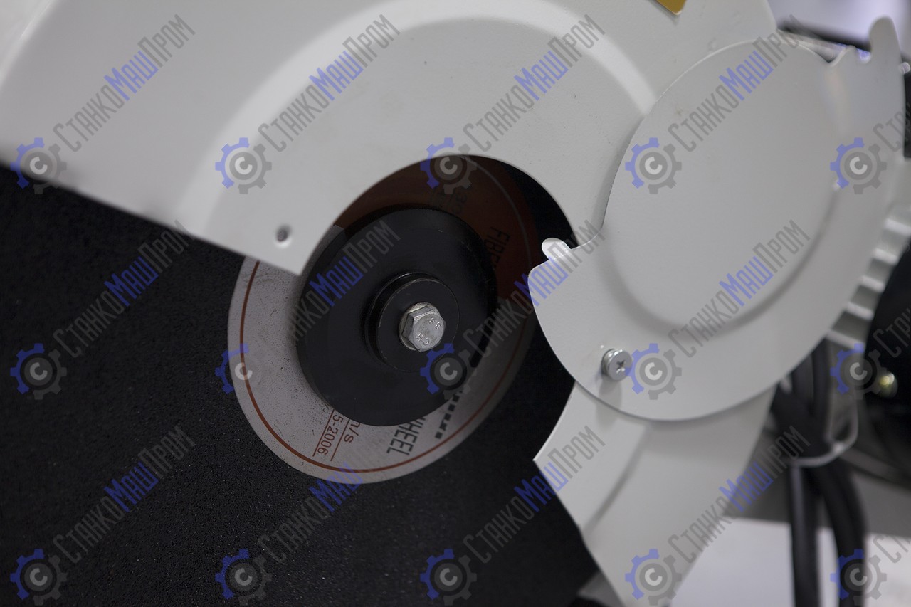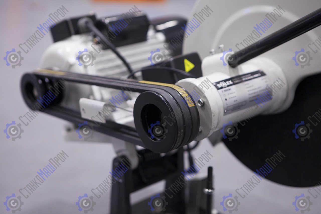 Мощный высокооборотистый однофазный двигатель (3кВт) с ременным приводом, оснащенный абразивным отрезным диском распространенного стандарта Ø400ר25,4(32) ×3,2мм обеспечивает эффективное и точное пиление. Передача вращения происходит при помощи двух прочных поликлиновых ремней, подобрать которые, при необходимости их замены, можно в любом магазине автозапчастей.