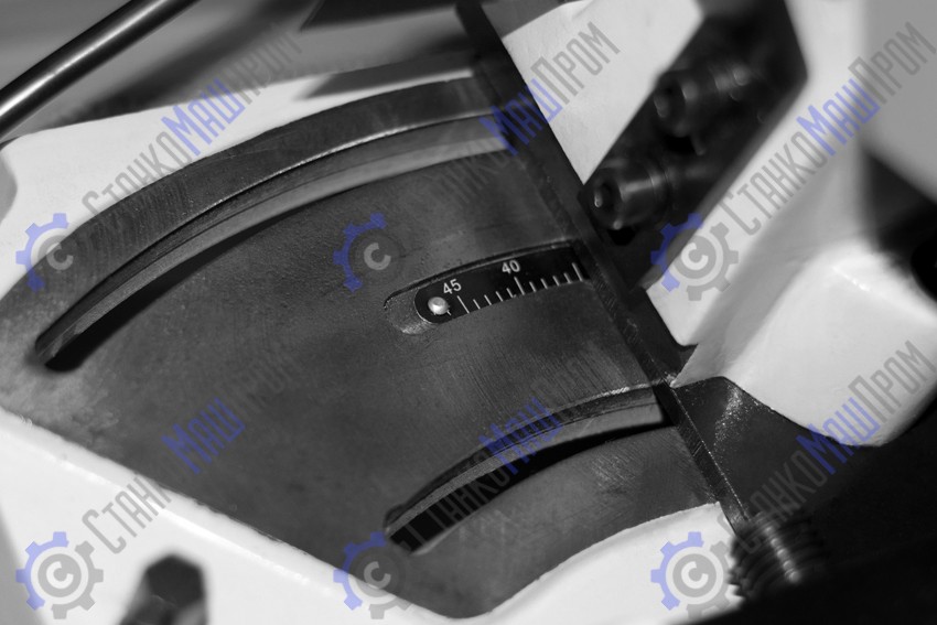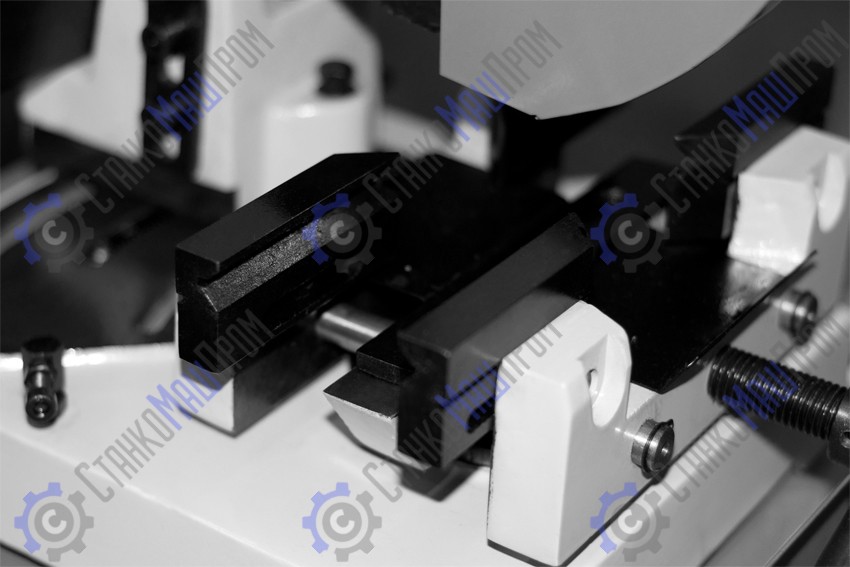 Прочная массивная станина с резиновыми регулируемыми ножками и встроенным баком для СОЖ емкостью 2,5 литра обеспечивает жeсткость конструкции и сводит к минимуму вибрацию при резке заготовки.