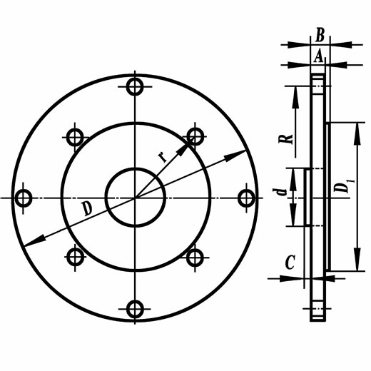 k - количество отверстий крепления фланца к планшайбе стола, по радиусу R
