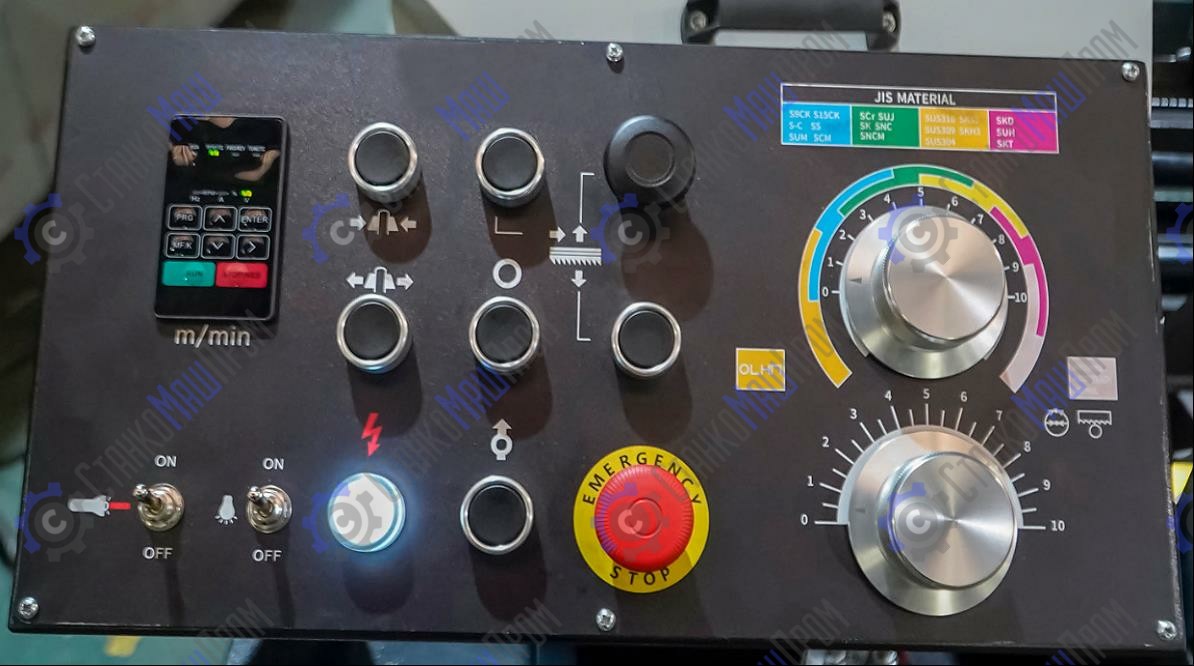 - Пульт станка PLC (панель HMI + кнопочное управление), для программирования и управления режимов резания