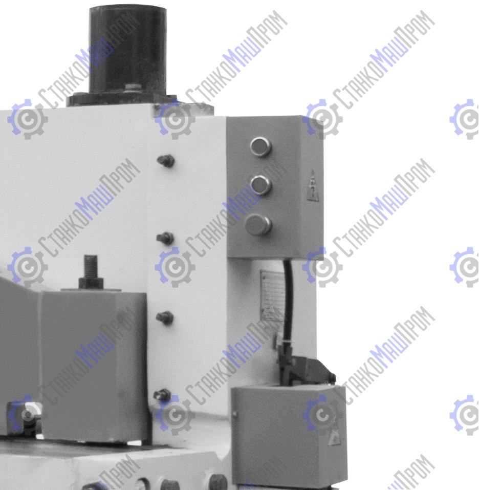 Станок оснащен качественными долговечными ножами из инструментальной легированной стали 9CrSi (российский аналог 9ХС), с твёрдостью закалки 40-50 HRC, с 4 режущими кромками на верхнем и нижнем ножах, толщина ножа 70мм. Кривошипно-шатунный механизм позволяет работать с высокой скоростью резки – до 50 циклов/минуту (в зависимости от толщины и материала), без перегрева станка (и дополнительным временем на его охлаждение), а также более низким потреблением энергии.