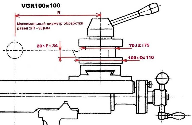 Установочные размеры для станка с резцедержателем шириной 100 мм: