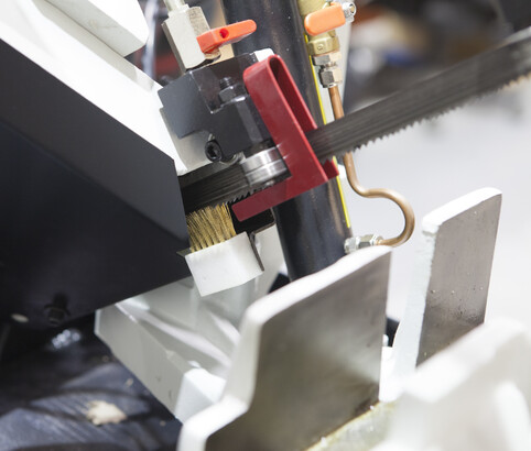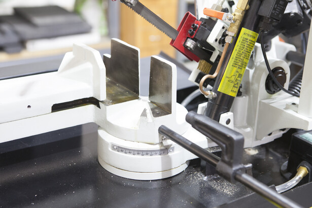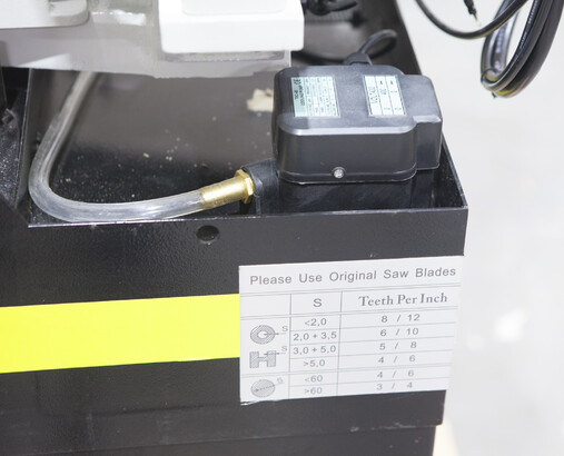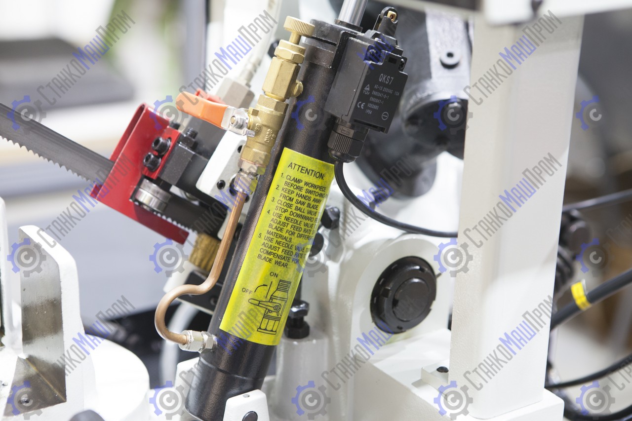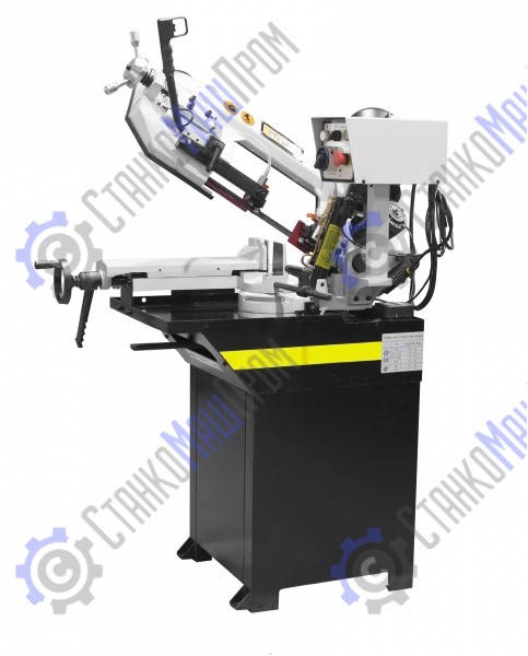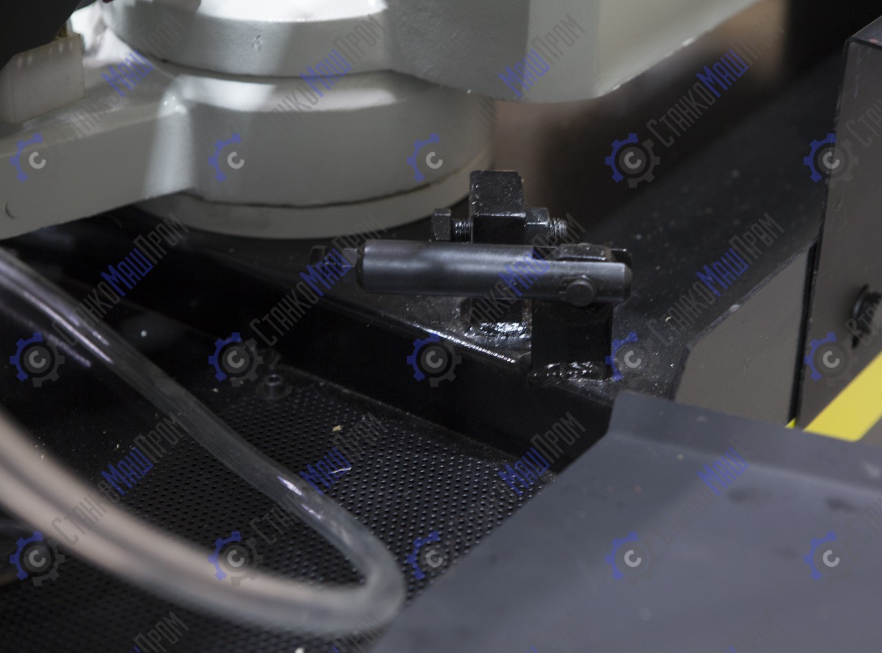 Модель имеет быстрорегулируемые тиски для резки под углом, поворачивается рама, а не заготовка. Тиски с системой быстрого отвода ускоряют процесс смены заготовки (ускоренный отвод подвижной губки происходит без вращения маховика). Зажим заготовки осуществляется тисками вручную, подача заготовки - также вручную. Наличие системы СОЖ в стандартной комплектации – позволяет добиться высокой производительности.