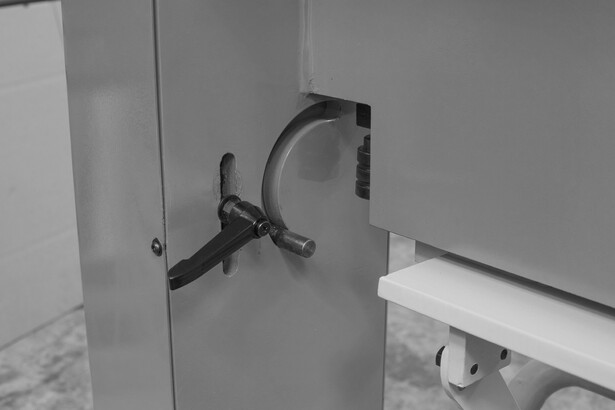 - Наличие ножного привода и механизм раскрытия верхней балки после загиба листа