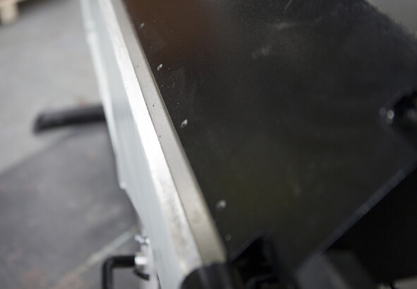 ![]() | Стальной сплошной уголок, отвечающий за прижим листа, крепится к прижимной балке через резьбовые соединения. |