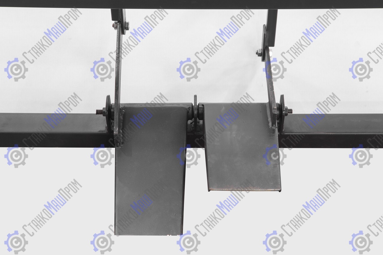 Прижимная балка станка не имеет вертикального хода, рабочее движение происходит за счёт эксцентрикового механизма - что позволяет даже при долгосрочной эксплуатации станка производить при необходимости не дорогостоящий ремонт. В противном случае станки с вертикальным подъёмом прижимной балки, не промышленного назначения весом менее 300 кг на длину 2500мм/3000м необходим дорогостоящий ремонт - боковые узлы вертикального подъёма разбалтываются после чего нужно либо: Вариант №1 регулировать станок на заводе-производителе; либо Вариант №2 разобрать и наваривать к узлам дополнительные вертикальные направляющие (Вариант №2 - это ремонт на один последний раз, вертикальные направляющие заваливаются назад, при этом прижимная балка выдвигается/выгибается буквально на миллиметры относительно других балок - после чего лист равномерно не прижимается и при гибке двигается).