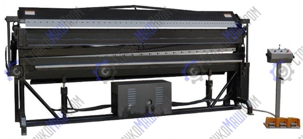 Станок имеет гидравлический бак – объёмом 5 литров. Листогиб и гильотина имеют задние регулируемые упоры. Гильотина имеет устройство компенсации прогиба. Прижимная балка и балка гибочная имеют регулировочные тяги для выравнивания. Прижимная балка имеет возможность фронтальной регулировки (глубины) относительно основной балки.