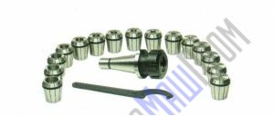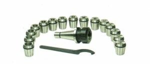 В набор входит: патрон цанговый, набор цанг и ключ.