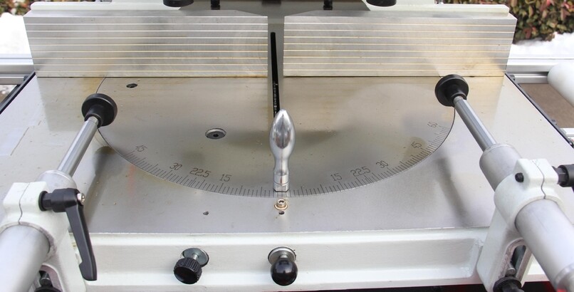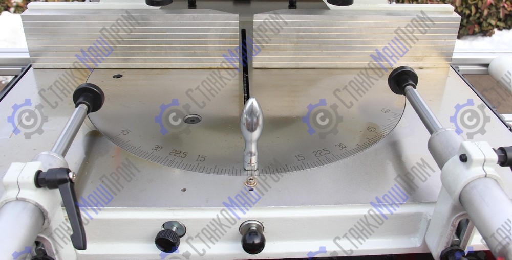 Пильный диск может резать заготовки под углом от 0-180º. Станок позволяет получить ровный угол и чистый край распила.Изменение угла резания, осуществляется легким поворотом ручки рабочего стола.