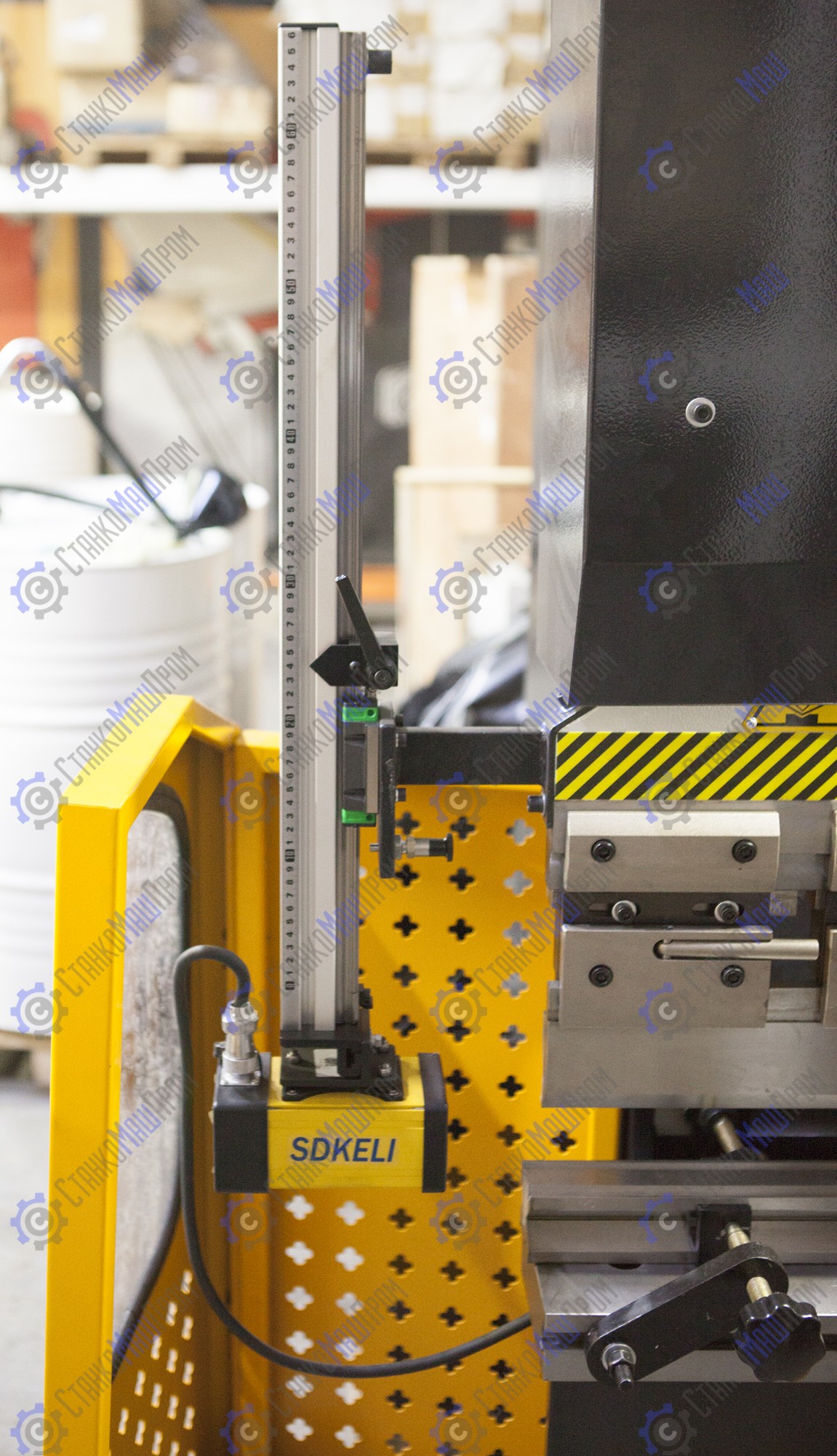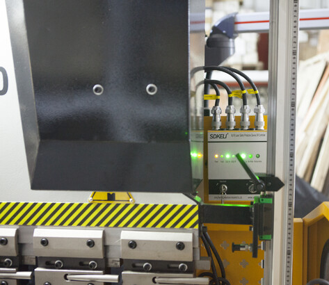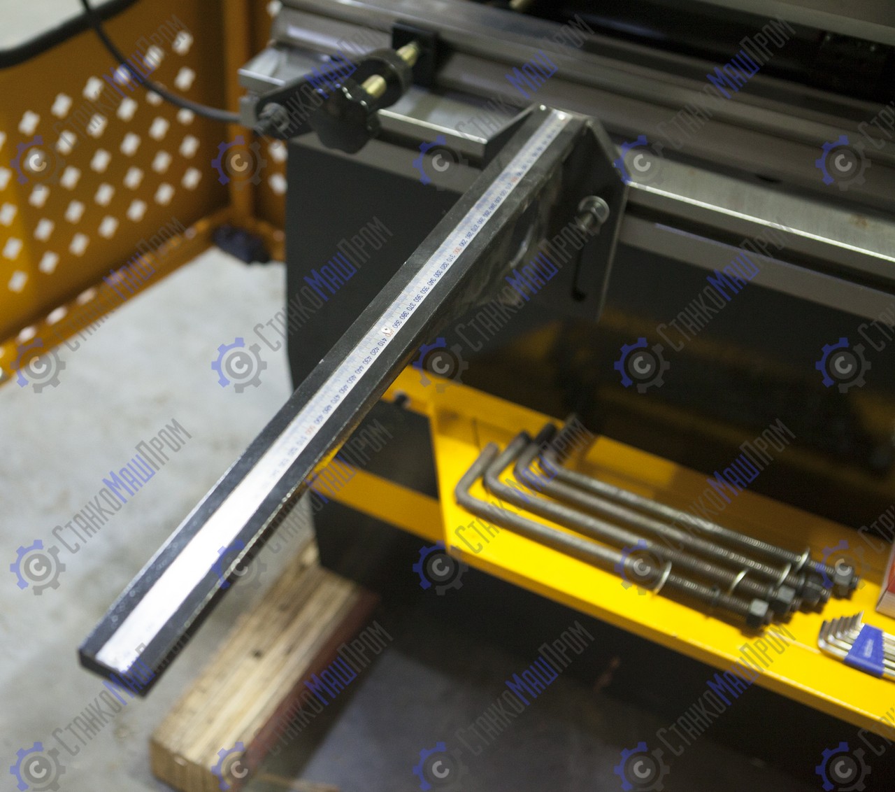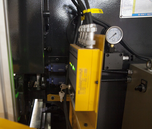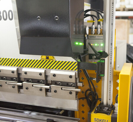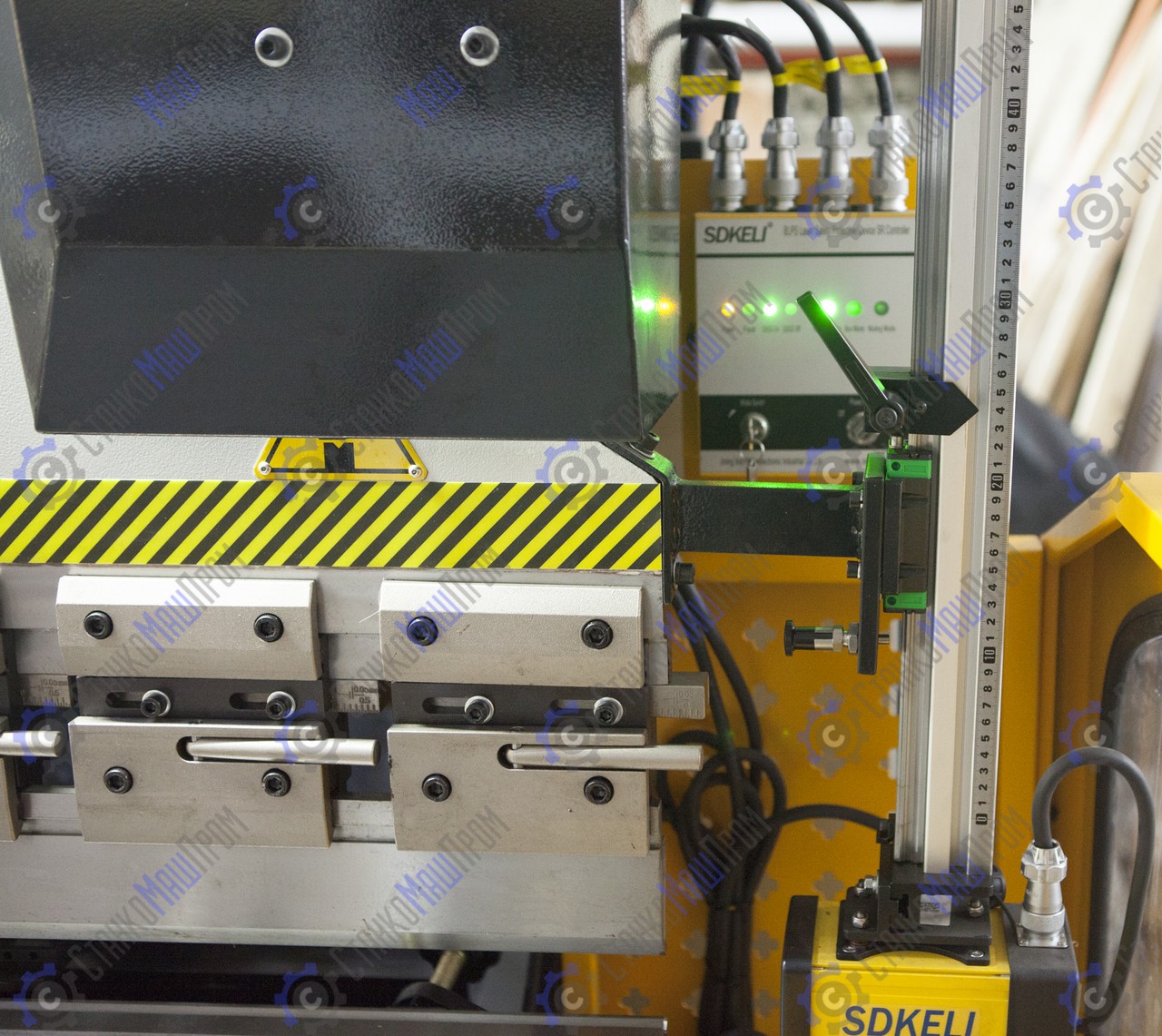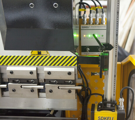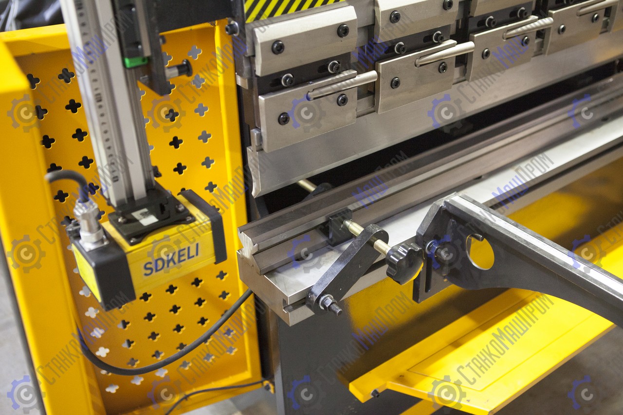 Регулировка по оси Y (ход траверсы) и X (ход заднего упора) осуществляется высокоточными двигателями от контроллера. Система позволяет отображать реальное положение осей станка и избавить оператора от вычислительных ошибок, возможность ввода значения математического ограничения движения механизмов (задних упоров и траверсы). Значения измеряемых координат отображаются на дисплее. Значение положения заднего упора гибочного станка поступает с датчика перемещения (энкодера), установленного на приводном винте ШВП. Положение траверсы гибочного станка отслеживается с помощью оптоэлектронных датчиков оптической линейки, установленной на станине станка (сигнал поступает на УЦИ преобразуясь в цифровое значение перемещения инструмента).