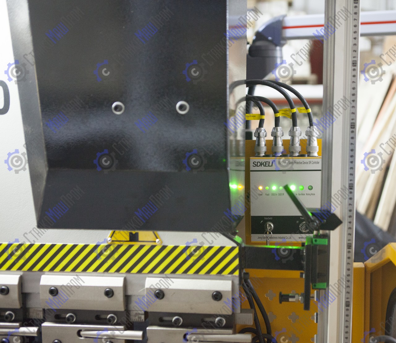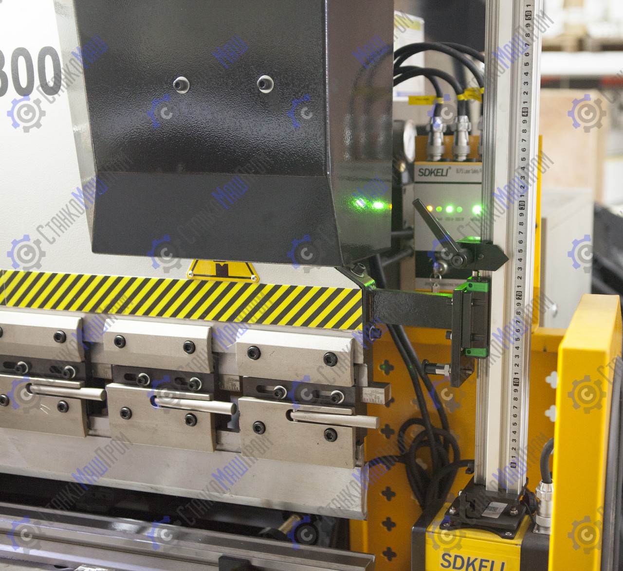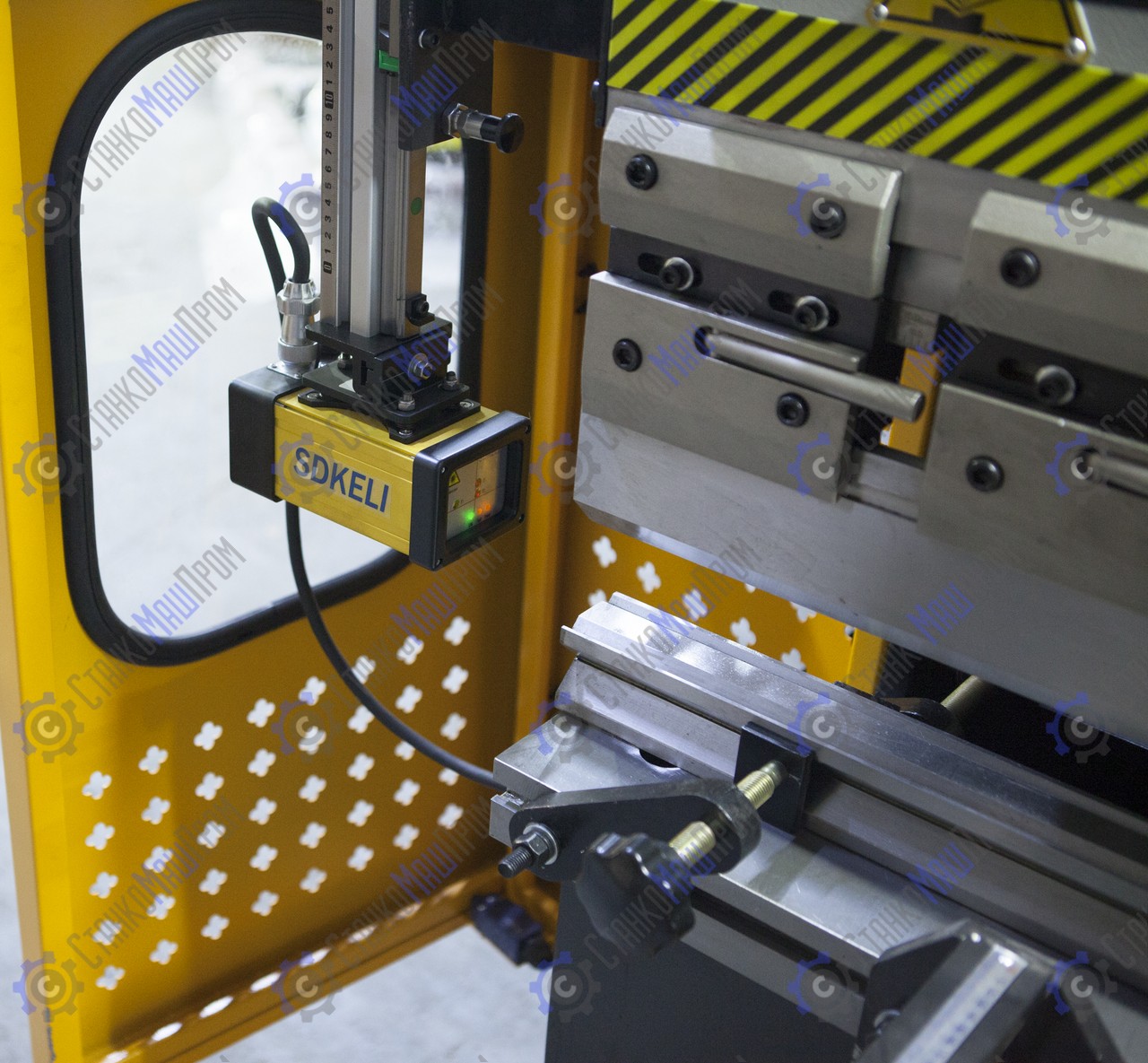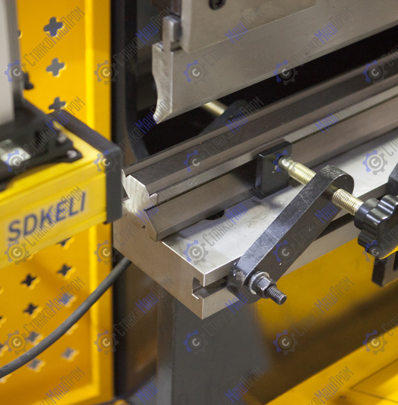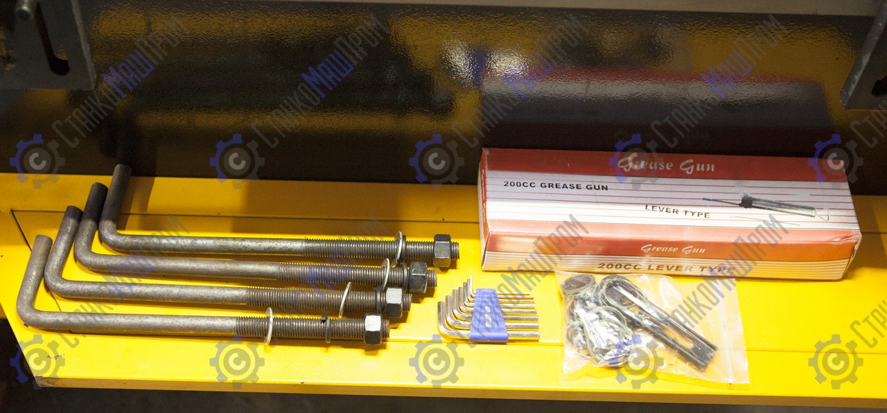 Станок оснащён - система управления Estun E21, алюминиевый рычаг с пультом управления, частотно-регулируемый привод, цифровое считывание по оси X/Y, предохранительный задний щиток и левый и правый боковые щитки, задний упор с силовым приводом с помощью шарико-винтовой передачи, основные электрические элементы Schneider, ножная педаль с аварийным остановом, верхний инструмент (пуансон) с функцией быстрого зажима, инвертор Schneider, передняя крышка со светодиодной лампой.