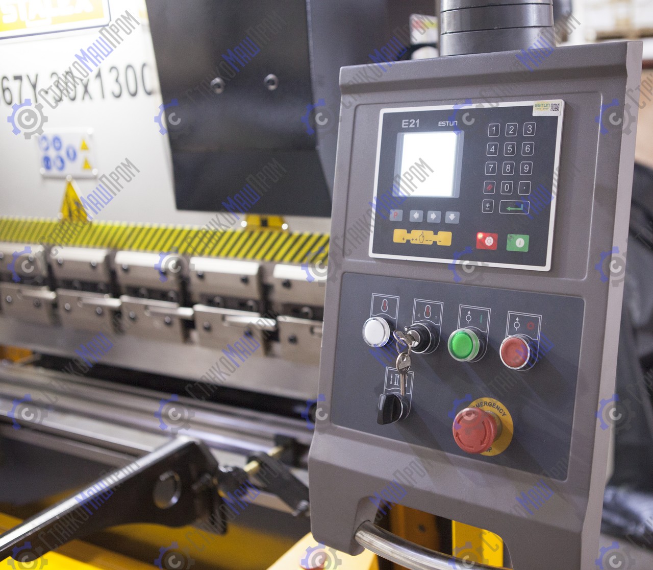 Управление гибочным прессом осуществляется при помощи оснащенного системой УЦИ Estun Е21, это промышленный контроллер с числовым программным управлением (ЧПУ), поддерживающей работу по двум осям Y / Х: