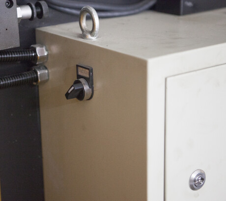 Датчик оптической линейки (установленной на станине станка) передаёт показания положения вала, при необходимости это положение по координате Y можно корректировать, регулируя любой из 2ух гидроцилиндров, ослабляя узел и выводя координату в необходимую точку/параметр при помощи УЦИ Estun Е21 - контроллер с числовым программным управлением (ЧПУ).
