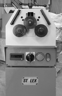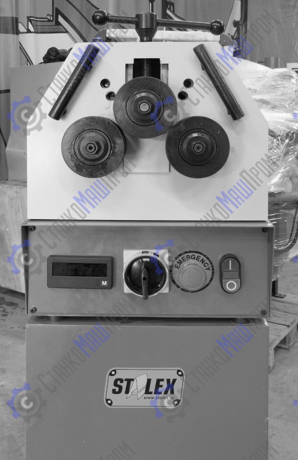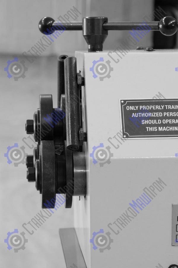 Станок управляется двумя ножными педалями, кнопкой аварийной остановки, на стойке размещена рукоять для переноса. В стандартной комплектации станка установлен цифровой дисплей (индикатор повторяемости) – для верхнего гибочного ролика.