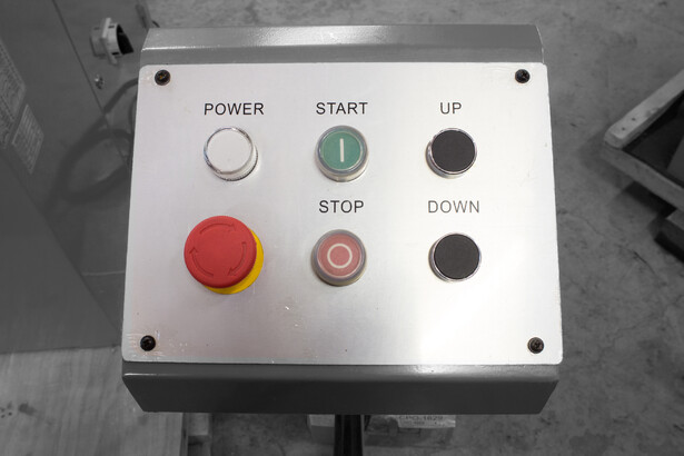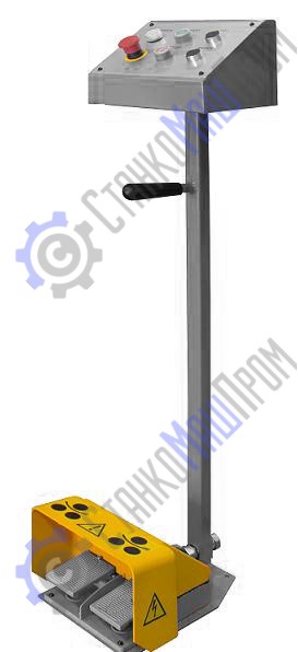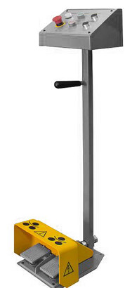 - Стойка управления с двумя ножными педалями и кнопкой аварийной остановки снабжена удобной ручкой для переноски