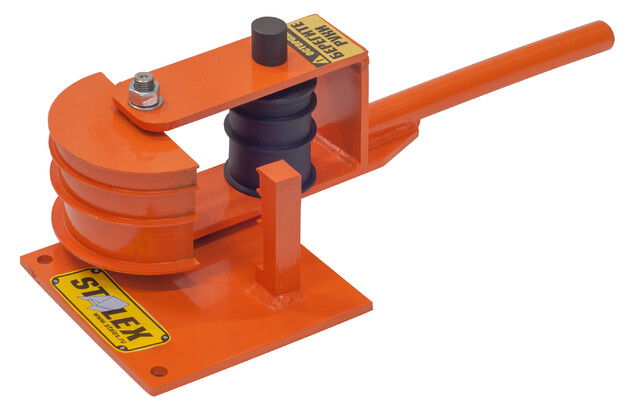Модель Stalex TR-12 оснащена тремя проточками 15 мм, 25 мм, 40 мм под профильные трубы с толщиной стенки до 1,5 мм. Отличительной особенностью станка является угол изгиба заготовки - 180°. Трубогиб имеет отверстия в основании для крепления к столу.