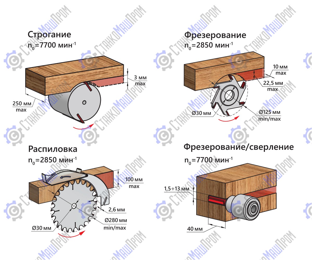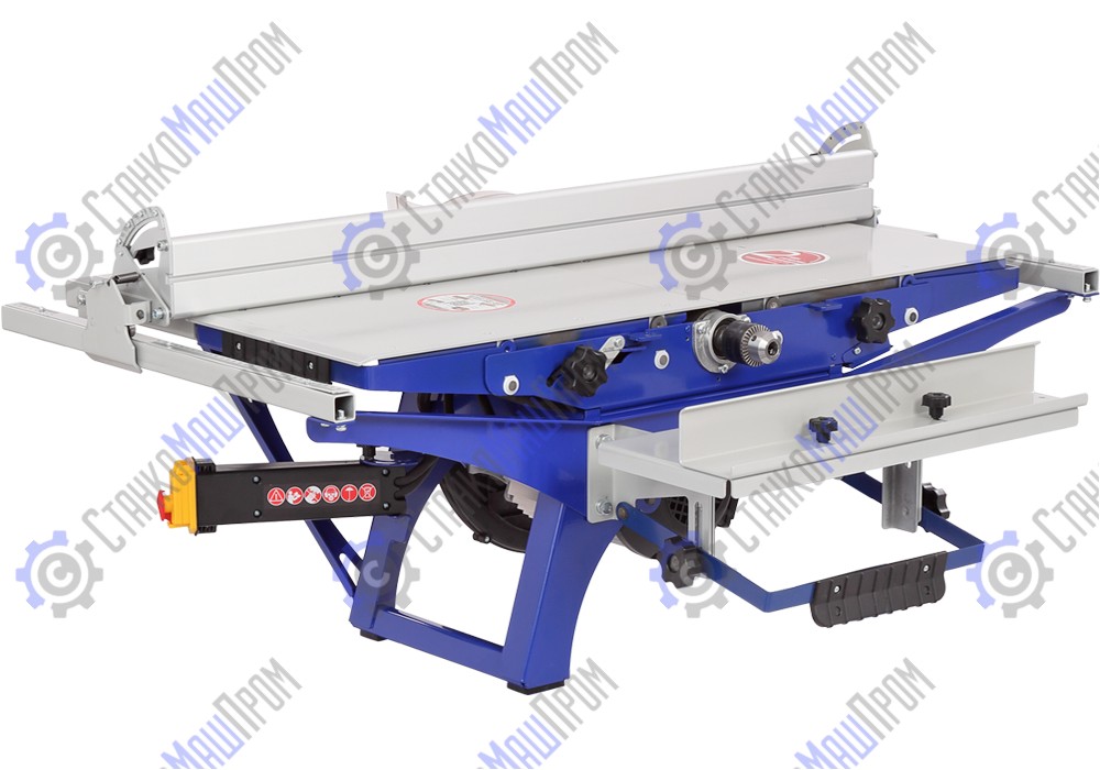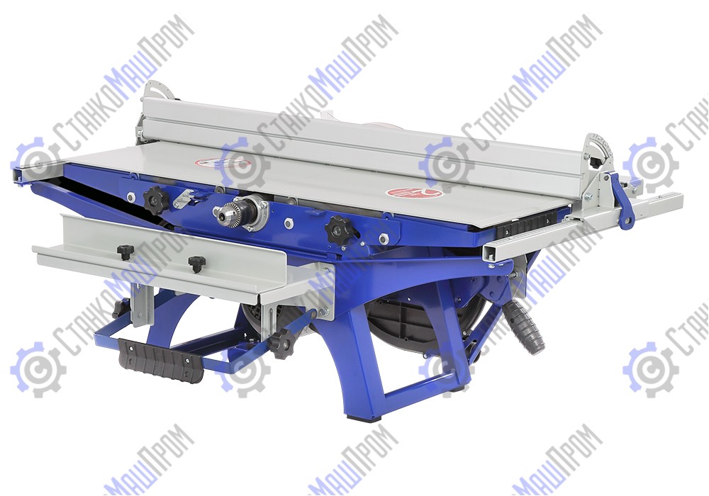 Пильный узел станка рассчитан на установку дисков диаметром 280 мм, что позволяет распускать заготовки до 100 мм высотой. Столы (пильный и строгальные) при этом образуют единую рабочую достаточно большую поверхность. Настройка высоты пропила происходит за счет изменения положения режущего инструмента. Кроме пильных дисков можно устанавливать дисковые фрезы диаметром 125 мм, шириной до 10 мм.