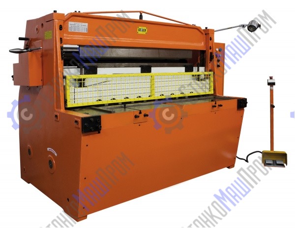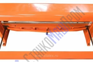 Конструкция станка при работе с гильотиной имеет функцию предподжима листа. Вместе с функцией предподжима в работе присутствует устройство защиты пальцев. Задняя часть станка имеет фиксаторы подачи листа (упоры) для резки листа на заданный размер. После резки заготовки смещаются по наклонной поверхности предотвращая их возможную деформацию.