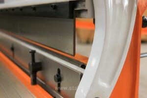 Гибка на максимальный угол 90°. Станок идеально подходит для обработки листового металла. Гибка происходит по типу гибки на прессе (пуансон х матрица). Пуансон состоит из 7 сегментов (размерам 50мм; 75мм; 75мм; 100мм; 200мм; 350мм; 500мм), матрица сплошная – это позволяет станку производить гибку так же и с более сложными профилями – для станка Stalex 3в1 1320х3. Станок оснащён устройством защиты пальцев, работая на станке в режиме гибки – защитное устройство опускается в низ на рабочий стол, ограждая зону резки от оператора.