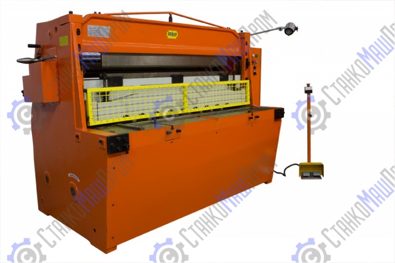 Конструкция станка при работе с гильотиной имеет функцию предподжима листа. Вместе с функцией предподжима в работе присутствует устройство защиты пальцев. Задняя часть станка имеет фиксаторы подачи листа (упоры) для резки листа на заданный размер. После резки заготовки смещаются по наклонной поверхности предотвращая их возможную деформацию.