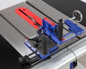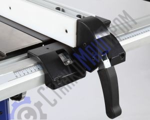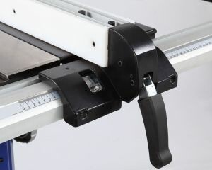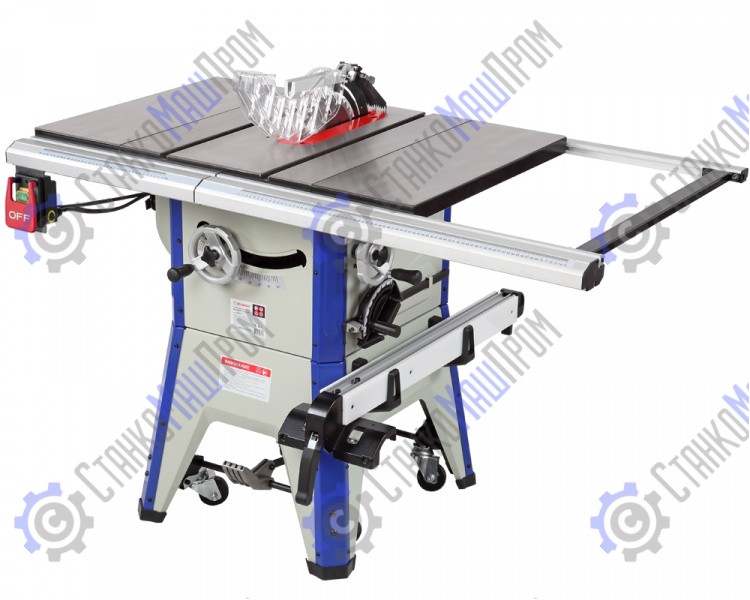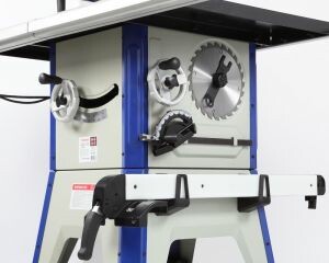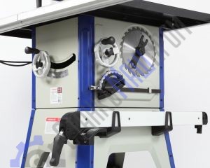 Для установки стандартных дисков с посадкой 30 мм в комплектации имеется переходное кольцо 16/30 мм. Станок оснащен основным рабочим столом и двумя дополнительными секциями из чугуна. Стол имеет два стандартных паза для установки углового упора или дополнительных приспособлений. На передней направляющей параллельного упора есть шкала для точной установки. На расклинивающем ноже установлена защита от обратной отдачи.