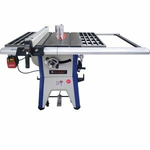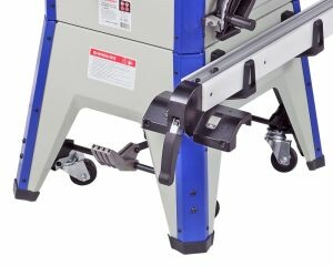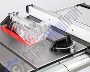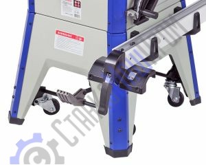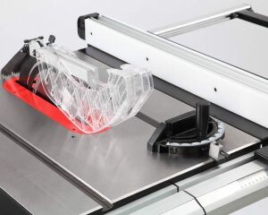 Для установки стандартных дисков с посадкой 30 мм в комплектации имеется переходное кольцо 16/30 мм. Станок оснащен основным рабочим столом и двумя дополнительными секциями из чугуна. Стол имеет два стандартных паза для установки углового упора или дополнительных приспособлений. На передней направляющей параллельного упора есть шкала для точной установки. На расклинивающем ноже установлена защита от обратной отдачи.