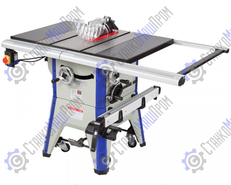 Станок оснащен основным чугунным столом и двумя дополнительными секциями из стали. Стол имеет два стандартных паза для установки углового упора или дополнительных приспособлений. На передней направляющей параллельного упора есть шкала для точной установки. На расклинивающем ноже установлена защита от обратной отдачи.