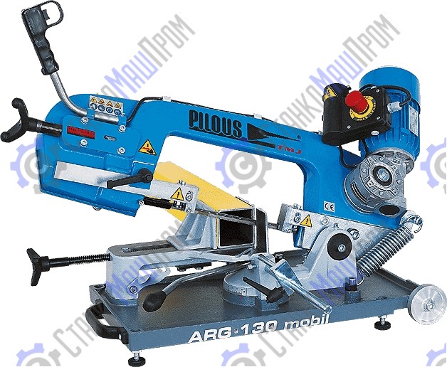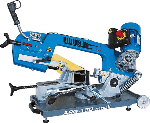 В базовой версии станки оснащены однофазным электродвигателем с питанием от электросети 220В/1/50Гц.Как опция доступен двухскоростной электродвигатель с питанием от промышленной электросети 380В/3/50Гц, что актуально при резании толстостенных и полнотелых заготовок. Пильная рама подаётся в зону резания вручную, преодолевая натяжение возвратной пружины. Подъём рамы осуществляется возвратной пружиной. Необслуживаемая червячная передача и трёхсторонние направляющие пильного полотна обеспечивают длительный срок эксплуатации станка и медленный износ полотен. ARG 130 Mobil – Настольная версия для пиления без применения СОЖ