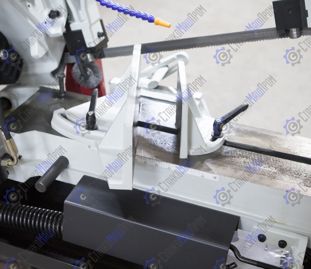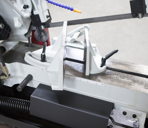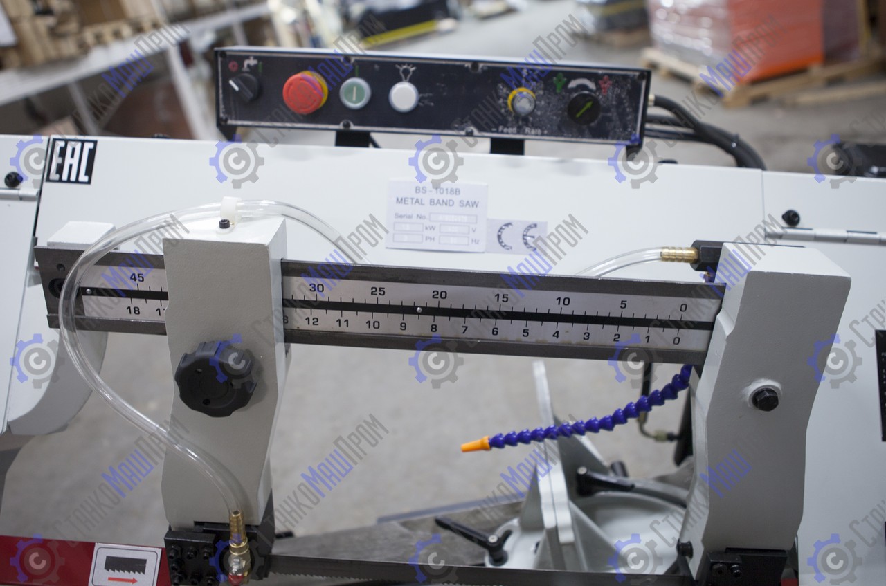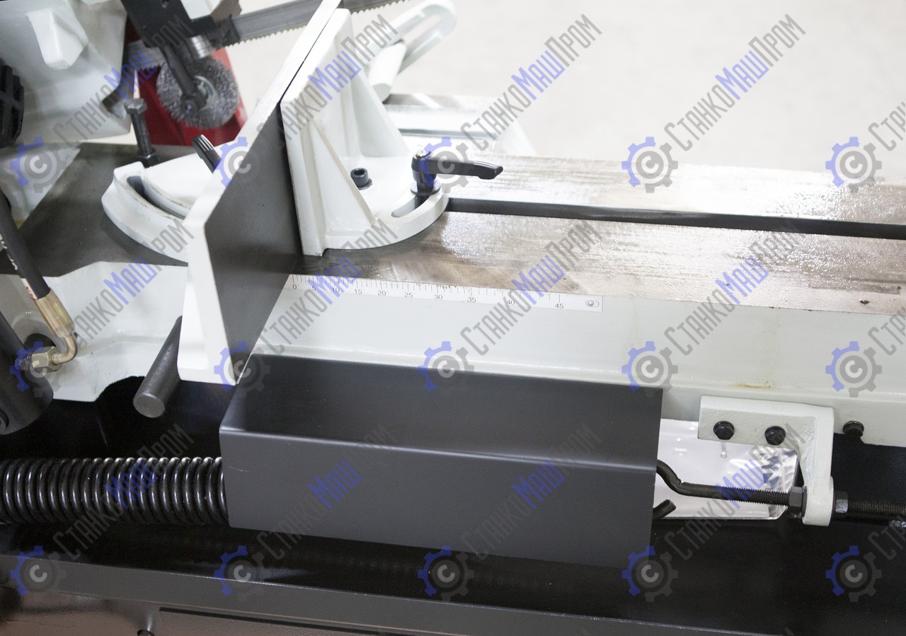В рабочей зоне резания полотно точно ведется двумя направляющими головками. Станок имеет поворот губок тисков, для пиления под углом необходимо изменять угол установки тисков. Высота полотна 27мм позволяет пилить c высокой точностью и параллельностью полые и профильные заготовки под различными углами, в том числе и сплошные заготовки. Расстояние от пола до тисков составляет 580 мм.