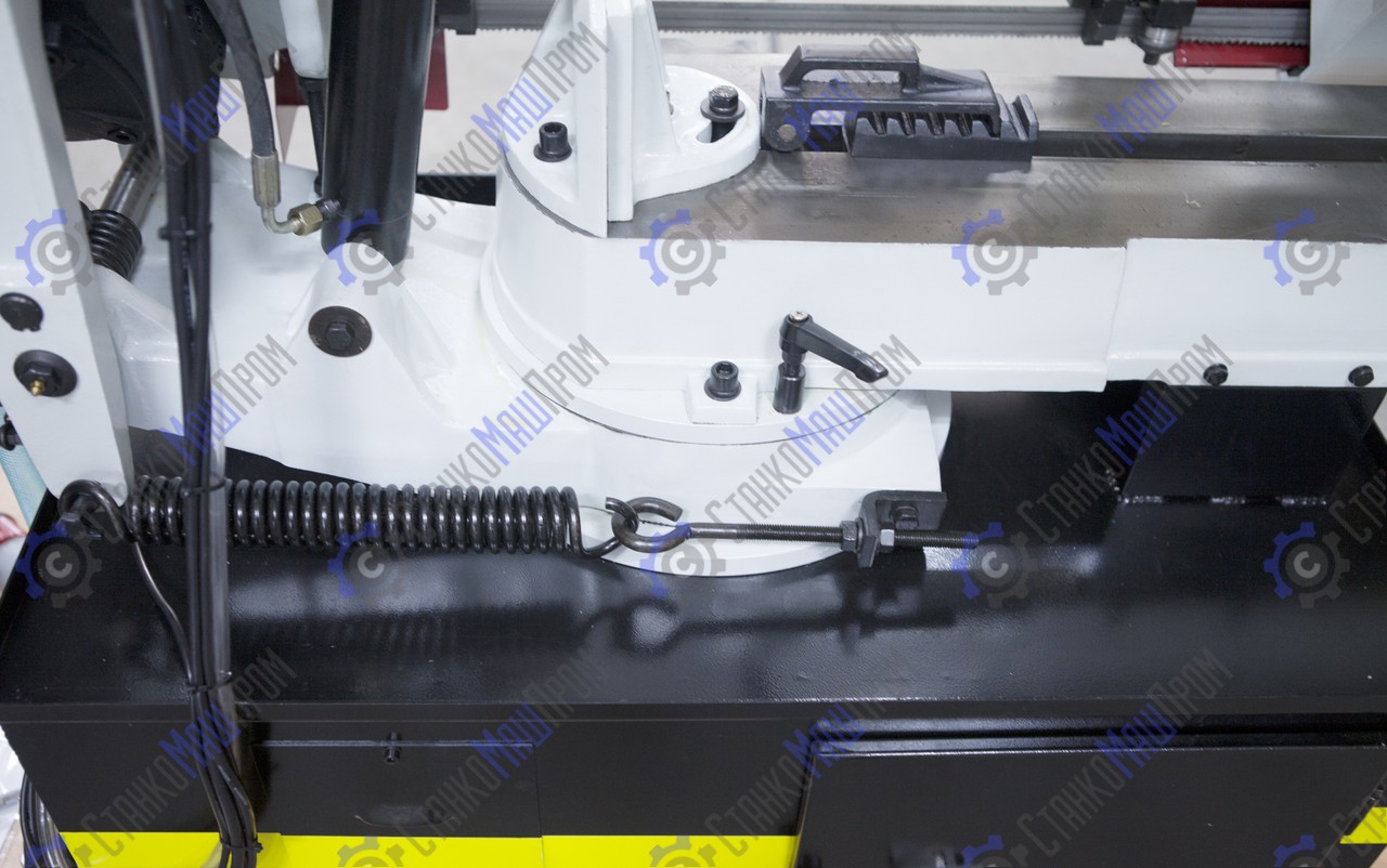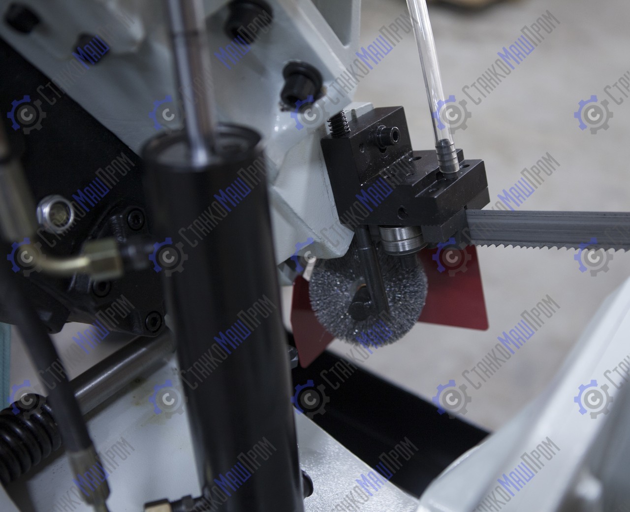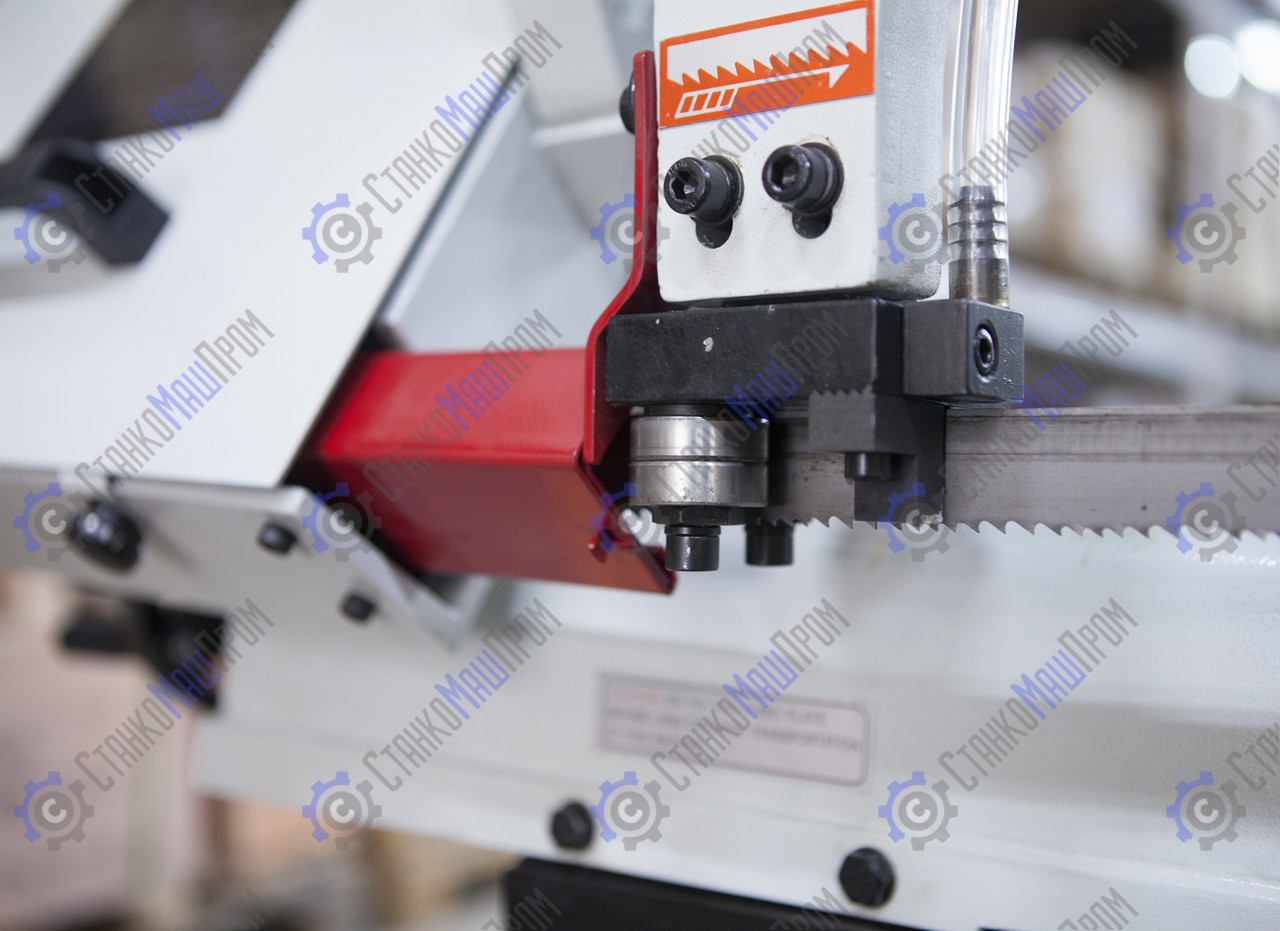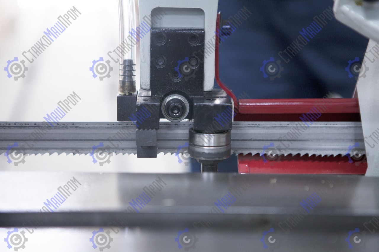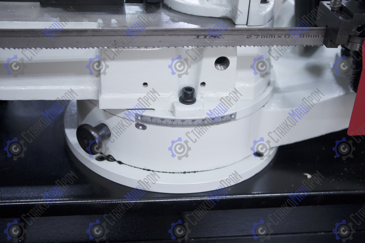 В рабочей зоне резания полотно точно ведется двумя направляющими головками. Станок имеет неподвижные тиски и поворотный механизм рамы, для пиления под углом необходимо изменить положение рамы относительно неподвижных тисков. Высота полотна 27мм позволяет пилить c высокой точностью и параллельностью полые и профильные заготовки под различными углами, в том числе и сплошные заготовки.