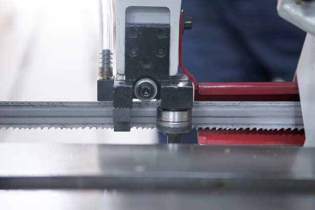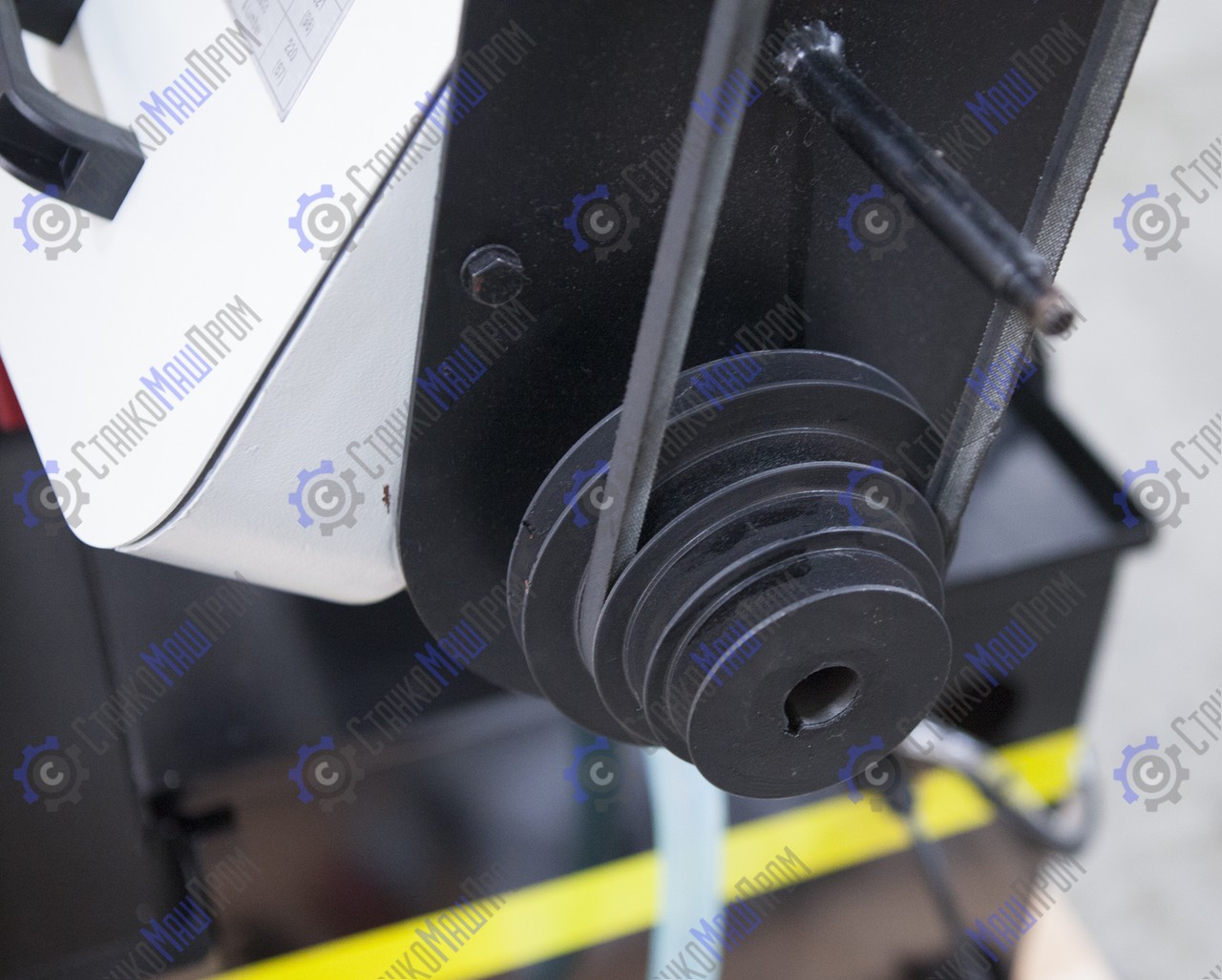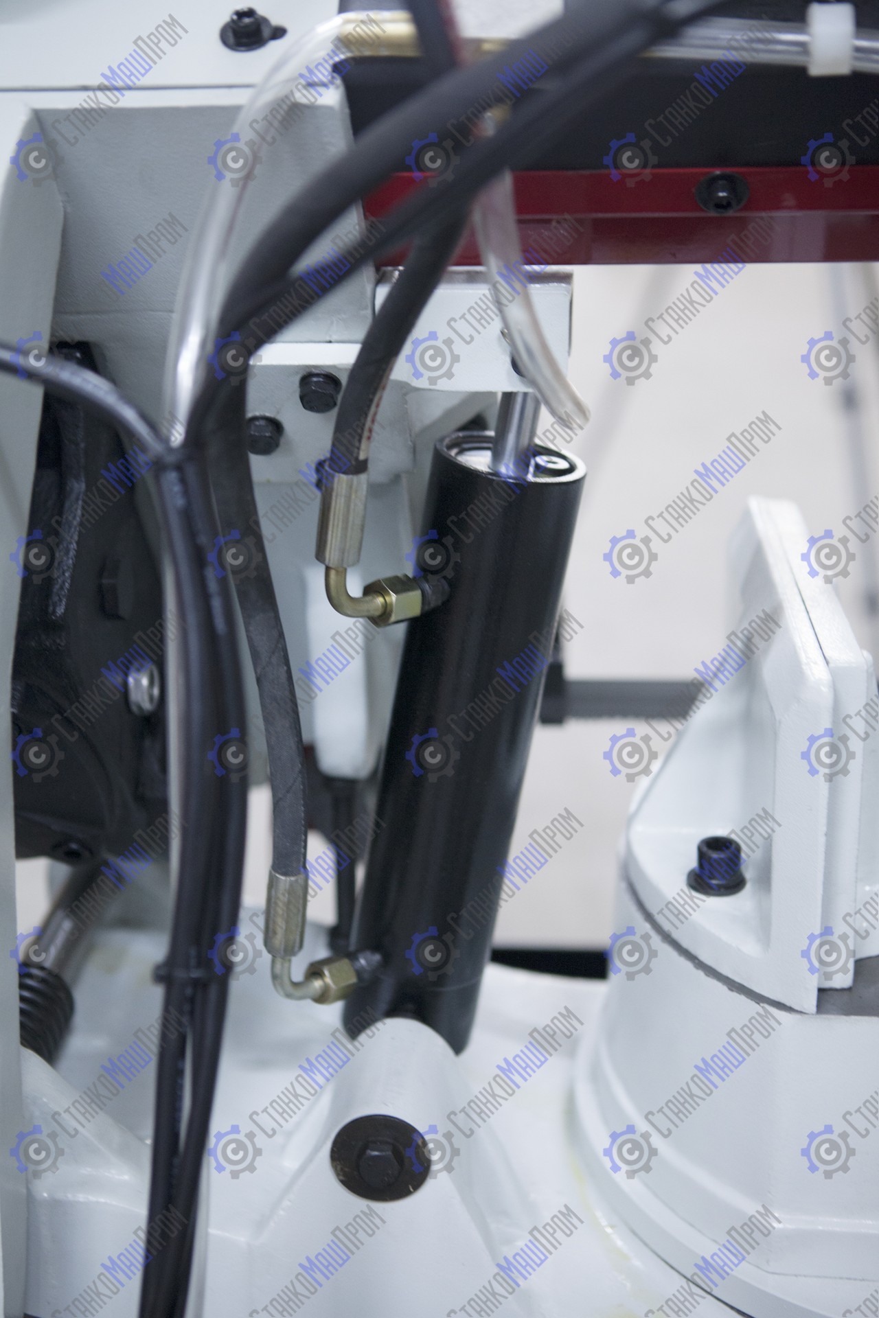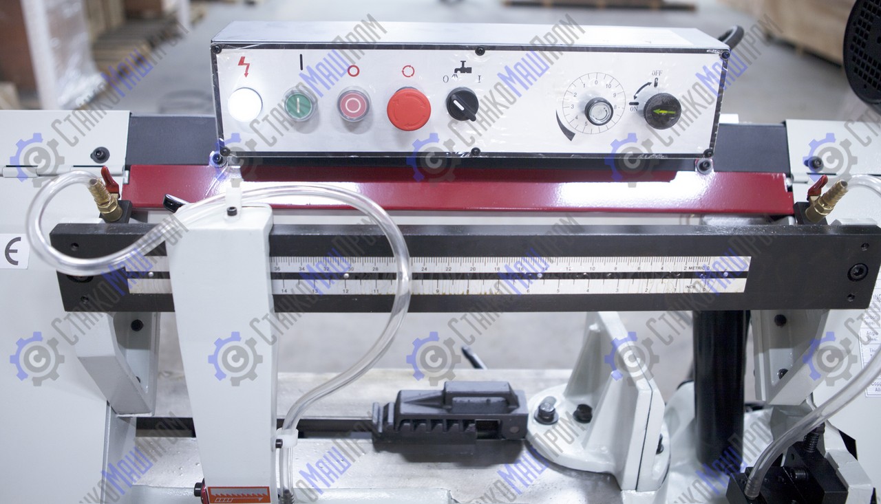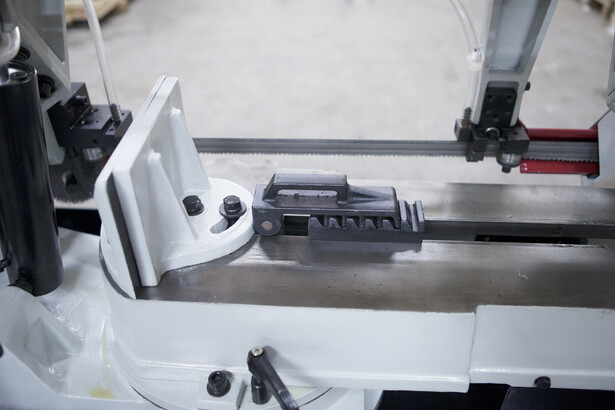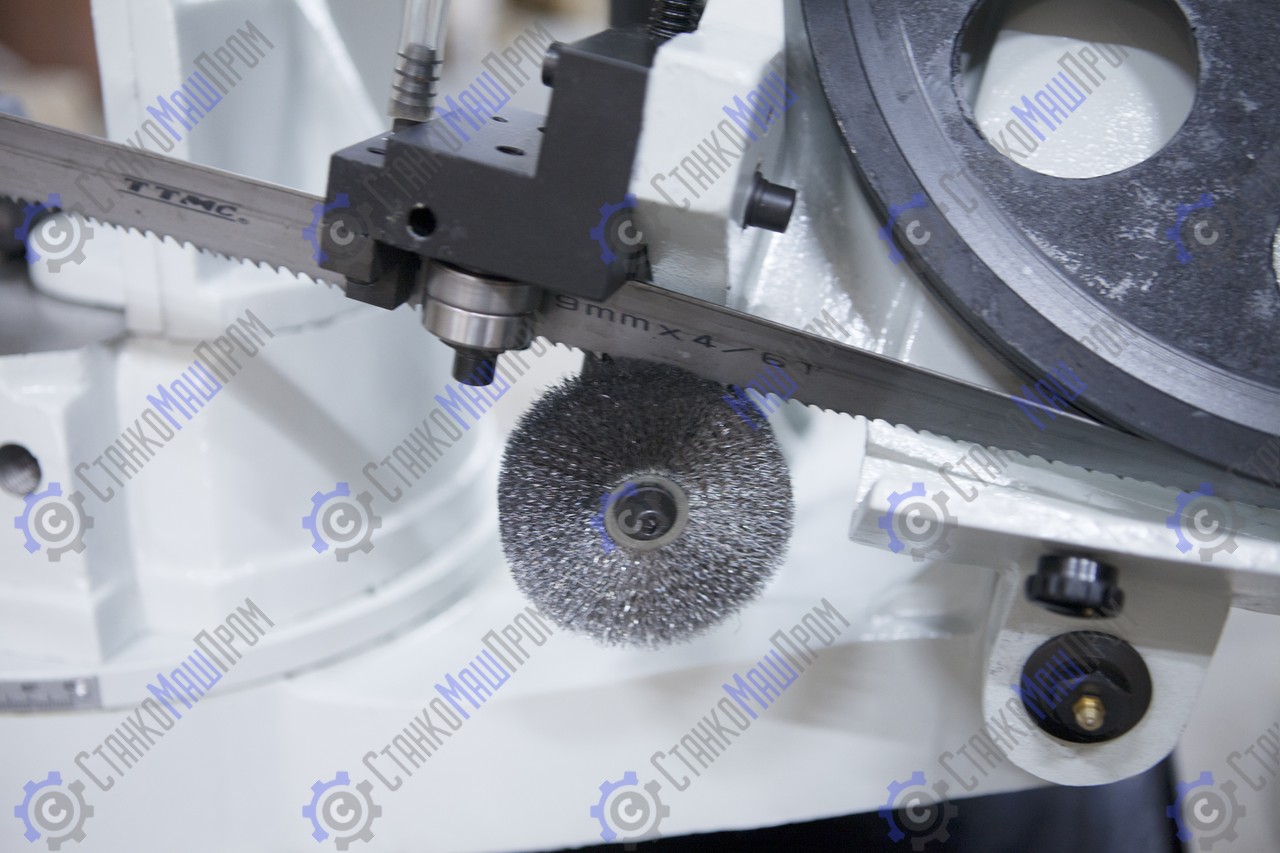 В рабочей зоне резания полотно точно ведется двумя направляющими головками. Станок имеет неподвижные тиски и поворотный механизм рамы, для пиления под углом необходимо изменить положение рамы относительно неподвижных тисков. Высота полотна 27мм позволяет пилить c высокой точностью и параллельностью полые и профильные заготовки под различными углами, в том числе и сплошные заготовки.