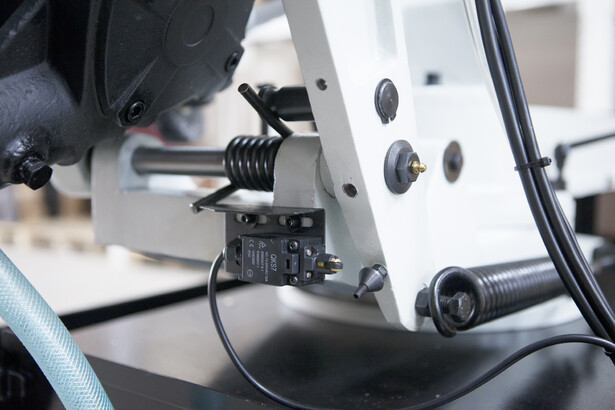 ![]() | Датчик выключения станка в нижнем положении пильной рамы. |