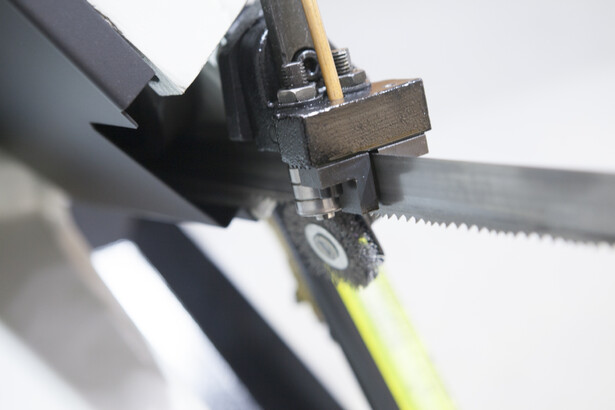 Пила опускается под собственным весом, станок оборудован дросселируемым гидравлическим цилиндрами подач, который позволяет автоматически подстраивать скорость опускания пильной рамы в зависимости от профиля заготовки, что обеспечивает оптимальные режимы распила.