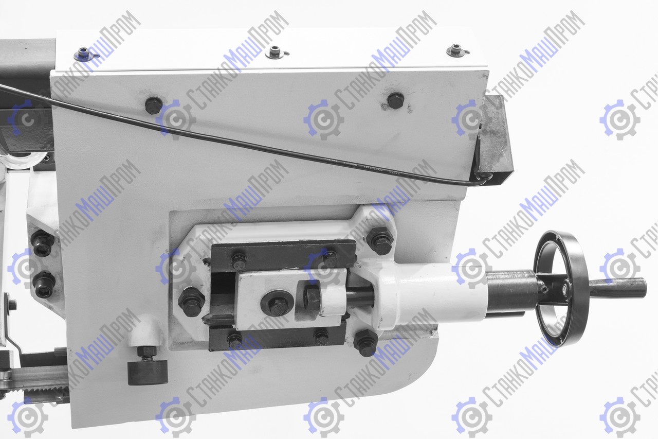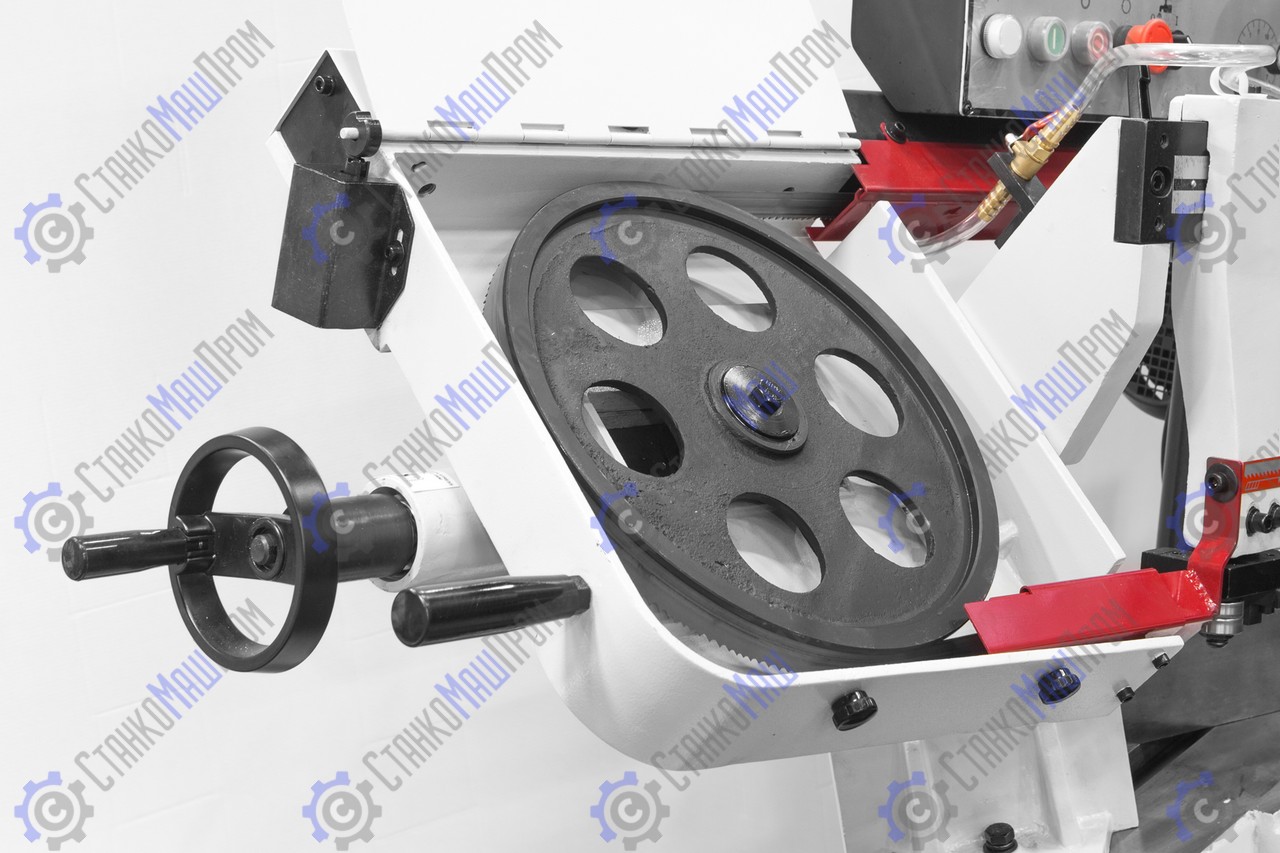 - Ручное натяжение ленты, маховик со встроенной шкалой позволяет быстро и легко производить натяжение пильной ленты. Концевики отключающие станок, при поднятии крышек маховика вращения полотна