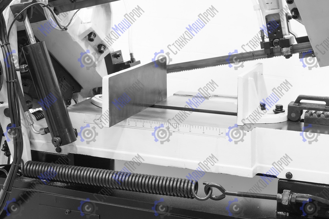 В рабочей зоне резания полотно точно ведется двумя направляющими головками. Станок имеет поворот губок тисков, для пиления под углом необходимо изменять угол установки тисков. Высота полотна 27мм позволяет пилить c высокой точностью и параллельностью полые и профильные заготовки под различными углами, в том числе и сплошные заготовки.
