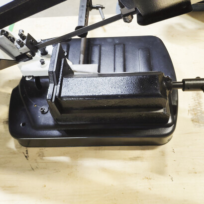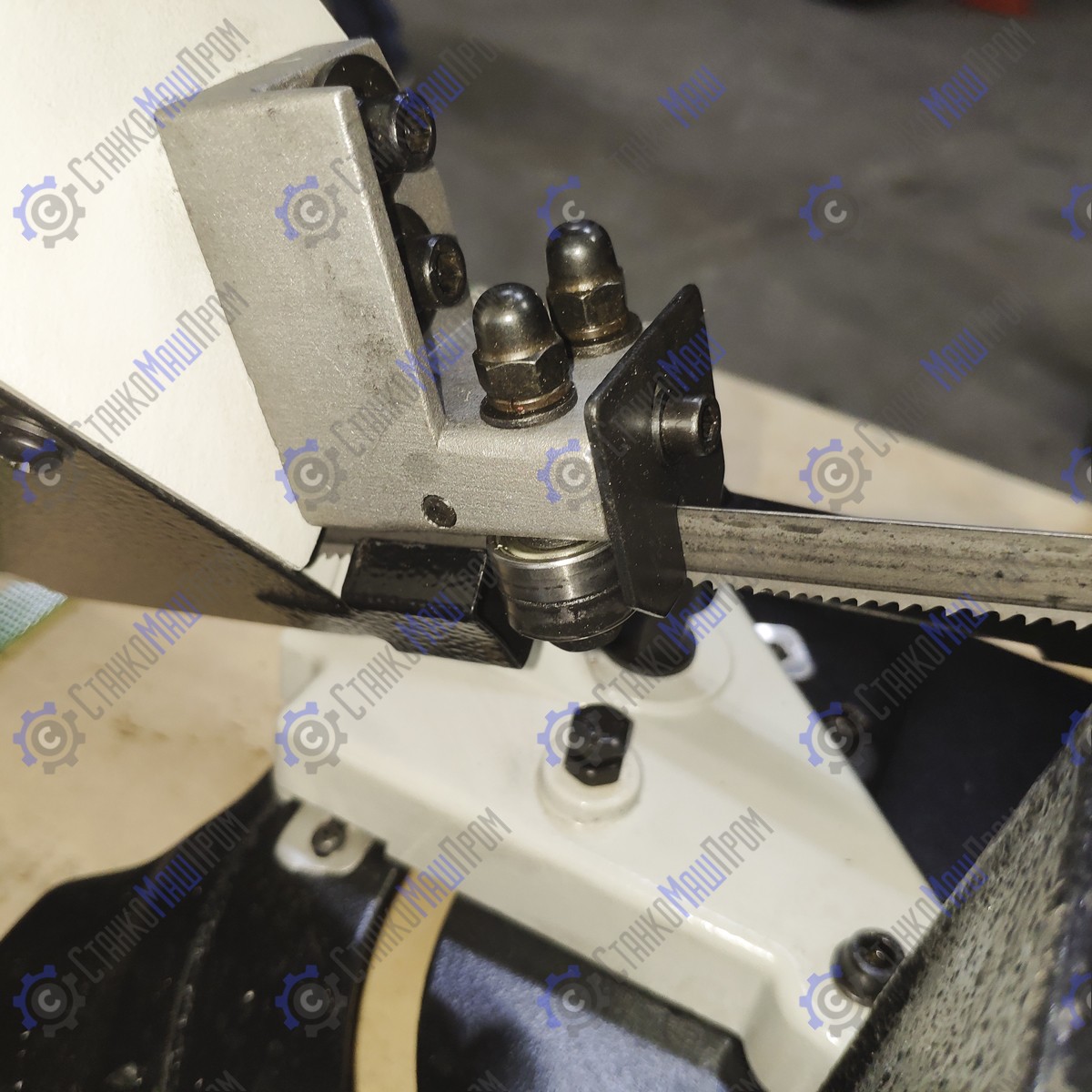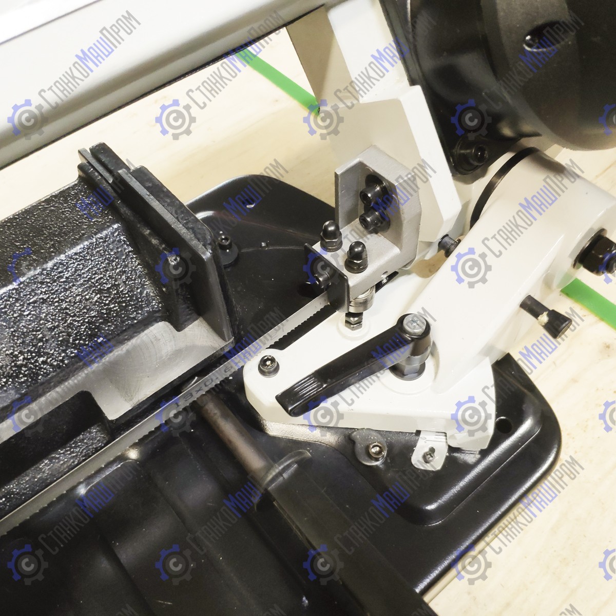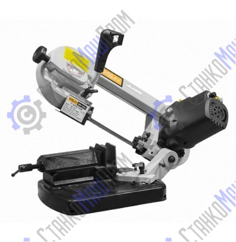 Режущий инструмент – бесконечная сварная ленточная пила. Полотно натягивается с помощью натяжного шкива. Натяжной шкив приводится в движение приводным шкивом, который в свою очередь, приводится через редуктор. Зажим заготовки осуществляется тисками вручную, подача заготовки - также вручную.