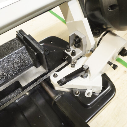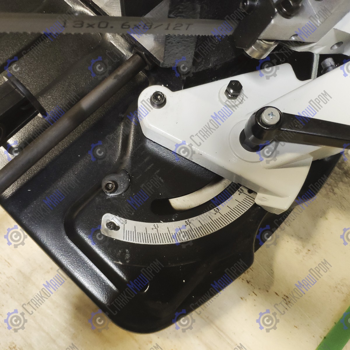В рабочей зоне резания полотно точно ведется двумя направляющими головками. Поворот корпуса пилы от 0° до +45°, предназначен для пиления заготовок, под различными углами и при частой смене угла пила.