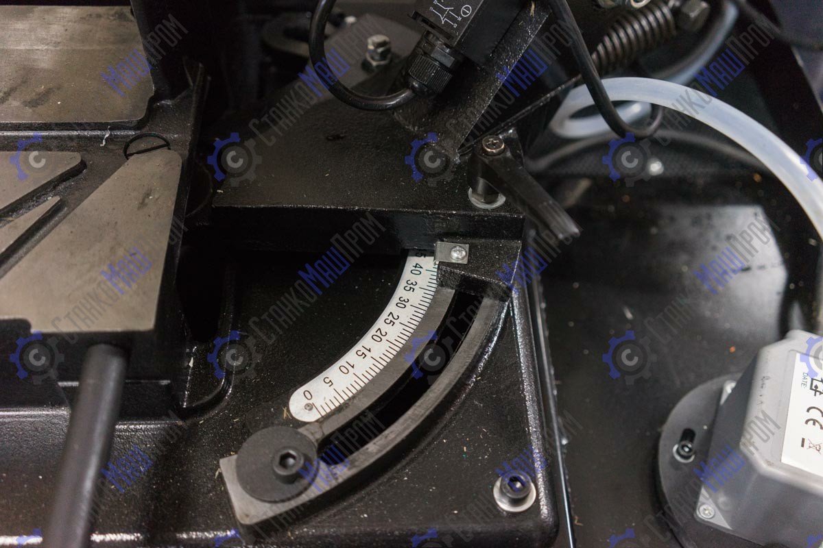 В рабочей зоне резания полотно точно ведется двумя направляющими головками. Станок европейского образца с возможностью поворота корпуса пилы от 0° до +45° и +60° (поградусно), предназначен для пиления заготовок, под различными углами и при частой смене угла пила.