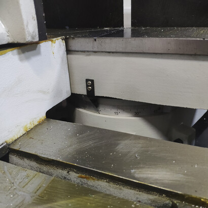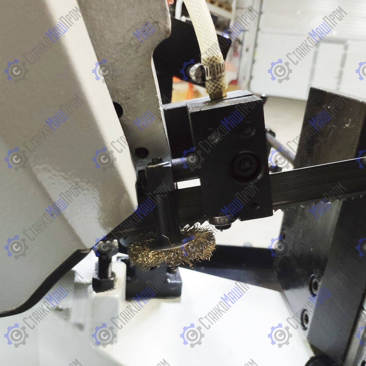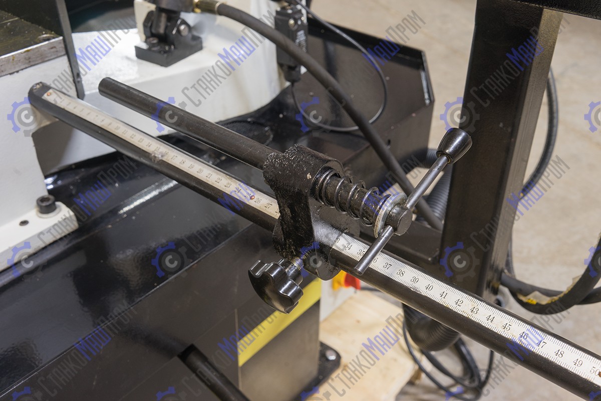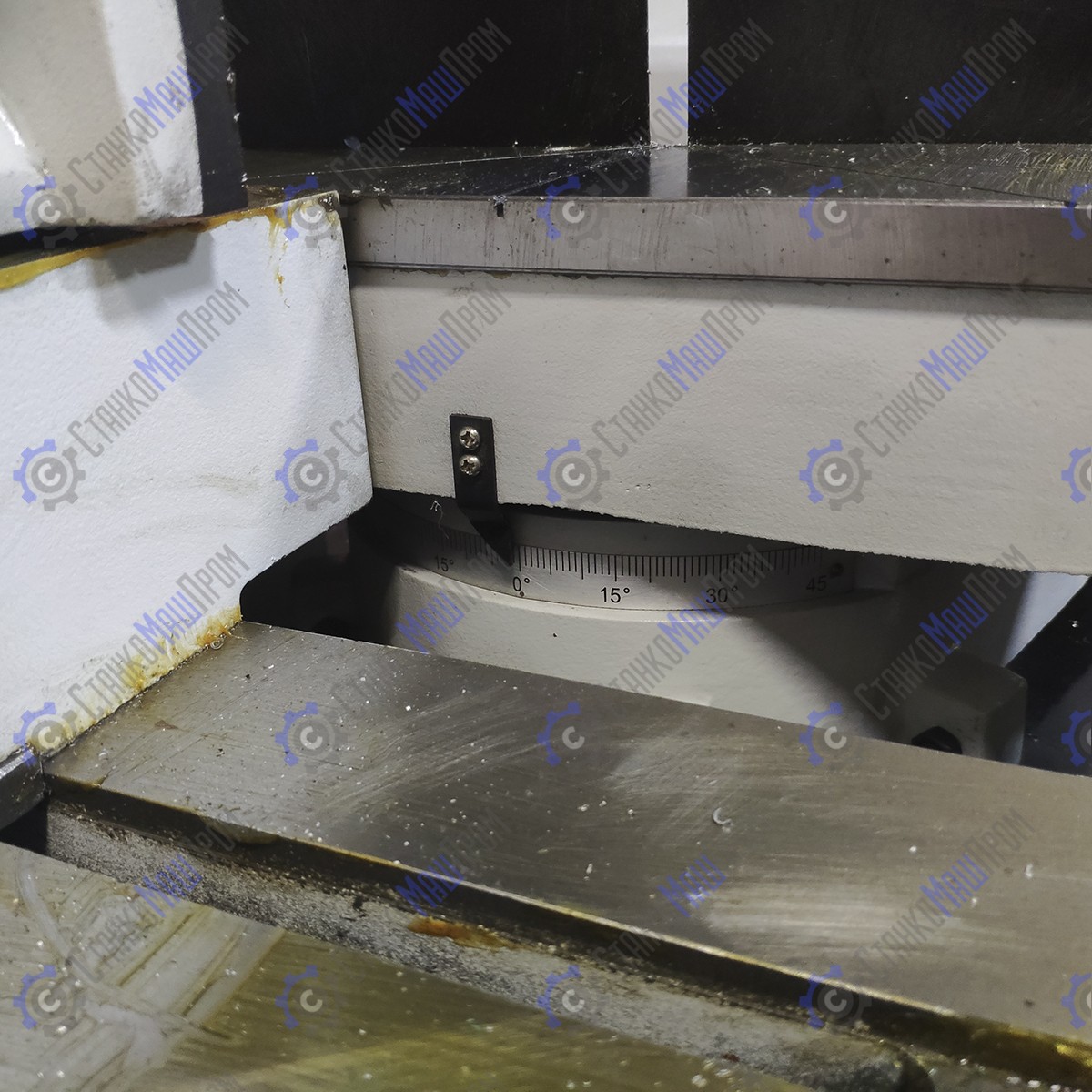В рабочей зоне резания полотно точно ведется двумя направляющими головками. Станок с возможностью поворота корпуса пилы от -45° 0° до +60°, предназначен для пиления заготовок, под различными углами и при частой смене угла пила (т.е. поворота рамы пилы по градусной линейке относительно неподвижных тисков).