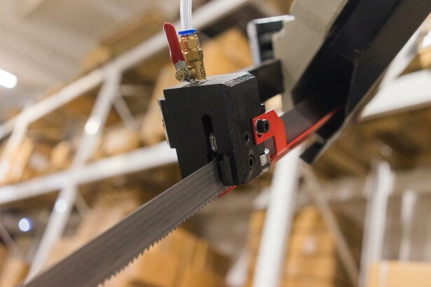 Пила опускается под собственным весом, станок оборудован дросселируемым гидравлическим цилиндром, который позволяет автоматически подстраивать скорость опускания пильной рамы в зависимости от профиля заготовки, что обеспечивает оптимальные режимы распила.