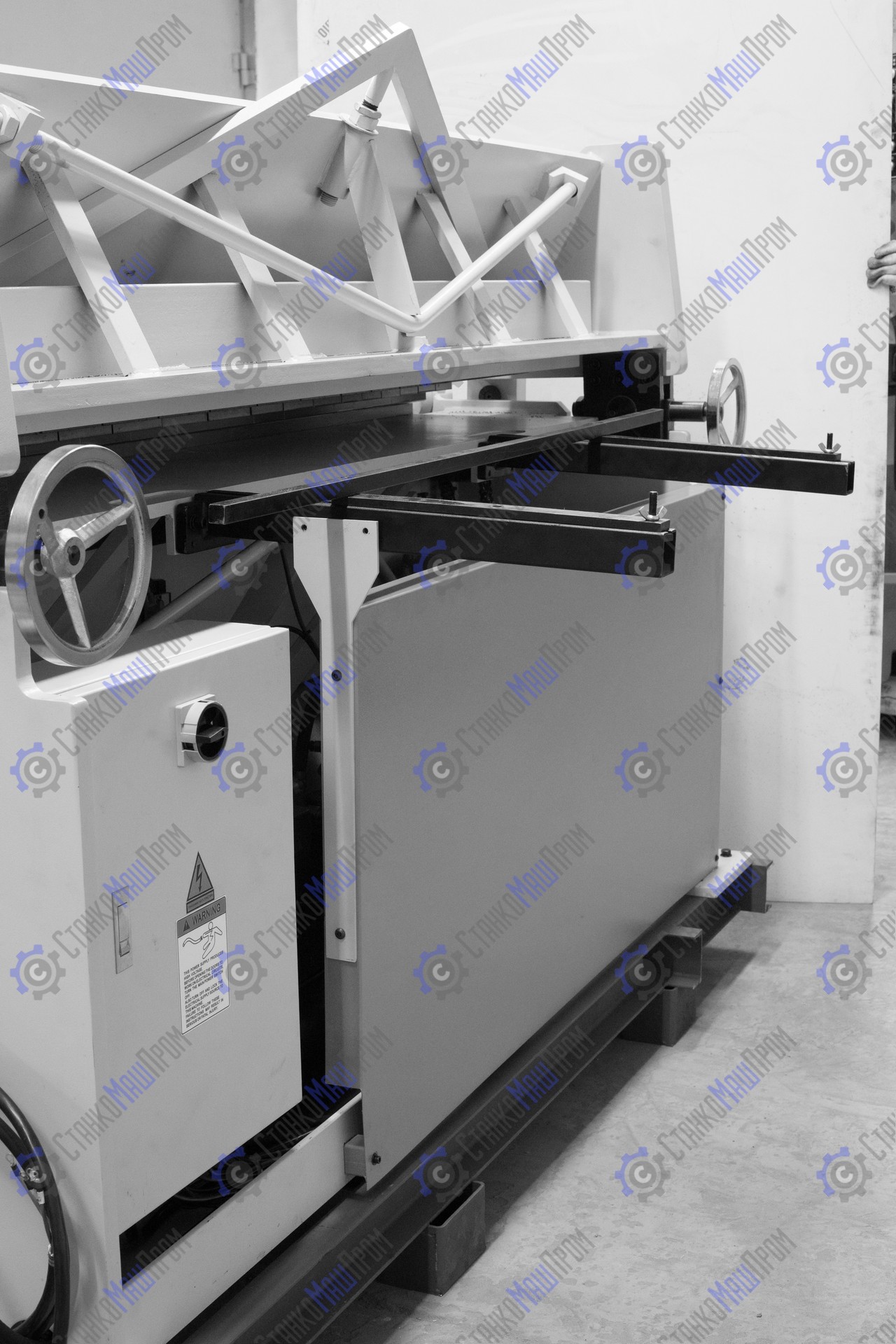 ![]() | Тыльная сторона станка, тяги регулировки верхней прижимной балки, механический упор, электрический шкаф, гидравлический цилиндр гибочной поворотной балки |