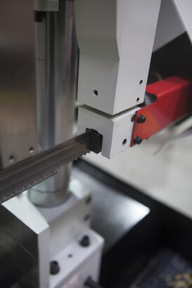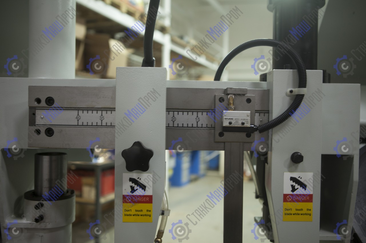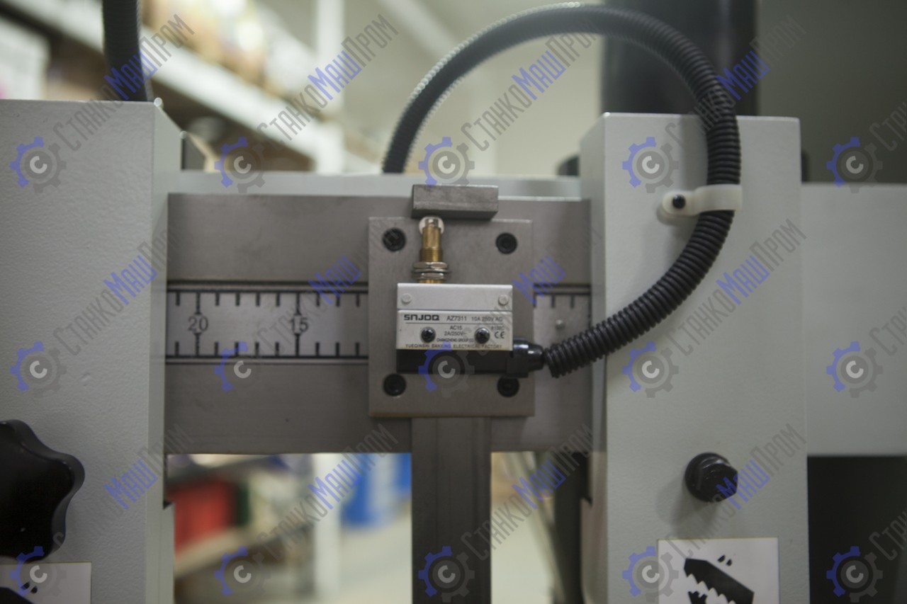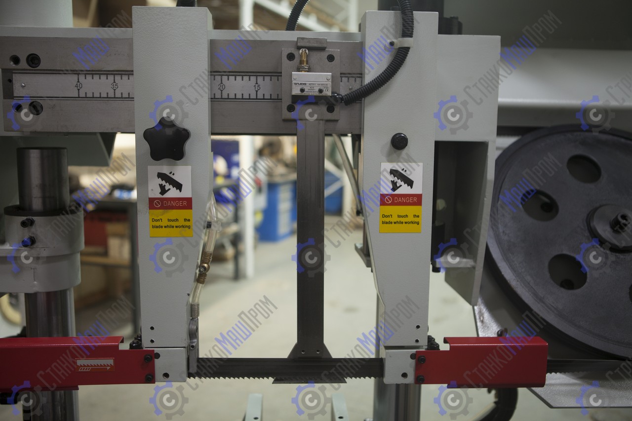 ![]() | Две направляющие перемещающиеся по салазкам, для регулировки жесткости полотна относительно размера заготовки Лампа освещения Концевик на отключение быстрой подачи |