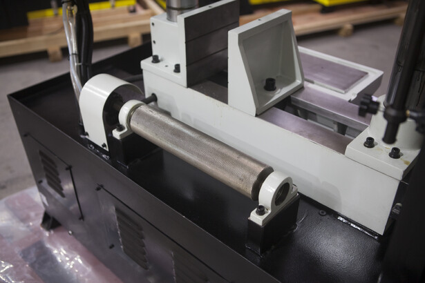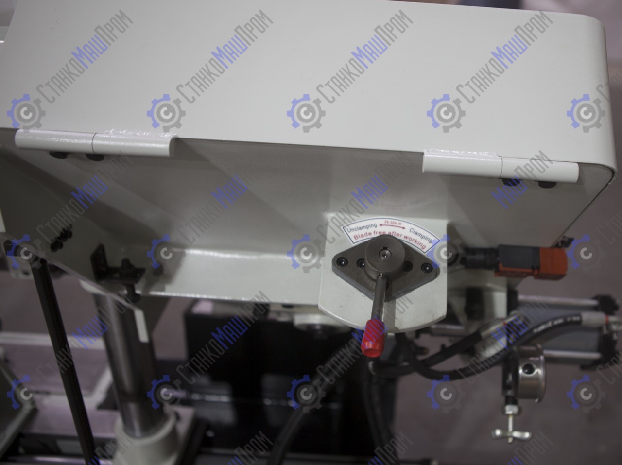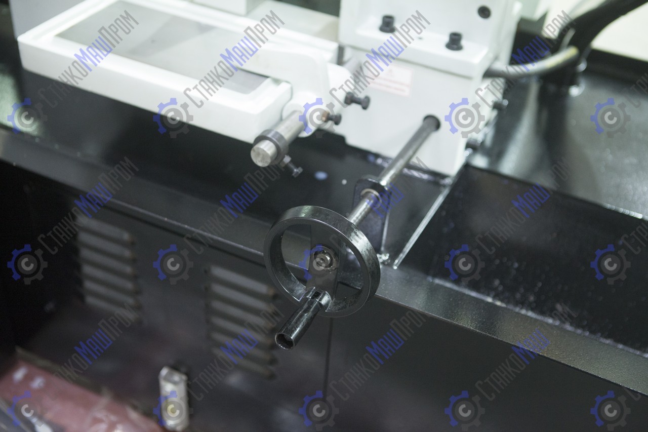 - Вспомогательный стол с роликом подачи приводится в движение вращением ручки маховика с передней части станка