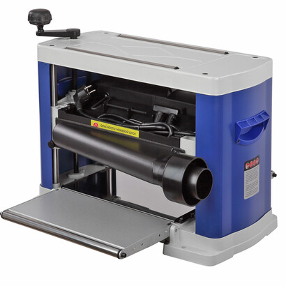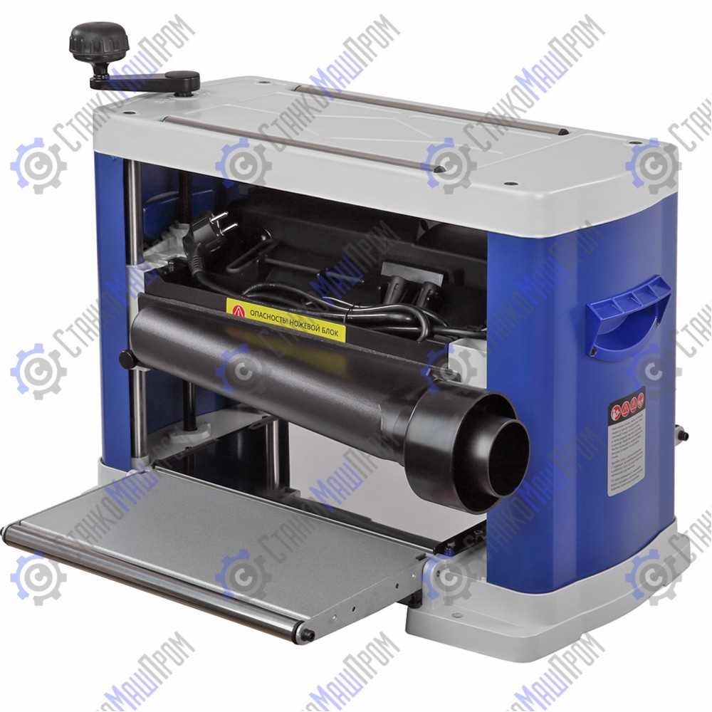 На ножевом валу установлены два ножа с двухсторонней заточкой. В случае затупления одной стороны, нож можно перевернуть и продолжать работу.Сверху станок закрыт защитным кожухом, являющимся одновременно опорой для протяжных роликов и связывающим элементом для несущих стоек и боковых панелей. Ролики используются для возврата заготовки на следующий проход. На торцах станка расположены ручки для переноски.