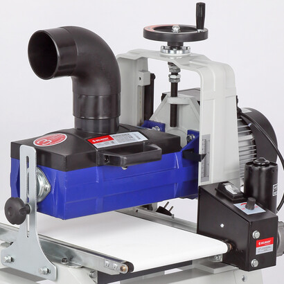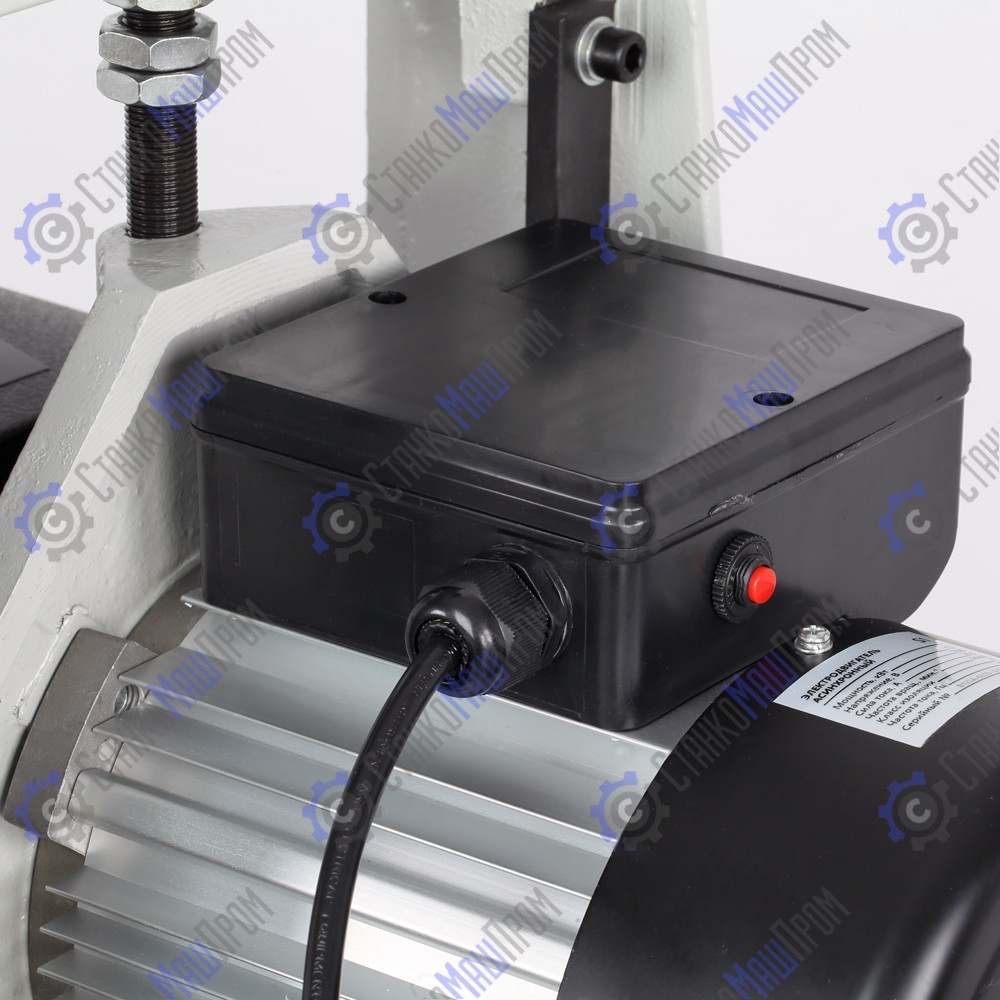 Панель управления простая, на ней расположен клавишный выключатель и ручка регулировки скорости движения транспортной ленты. На кожухе шлифовального блока имеется патрубок для подключения системы пылеудаления (диаметр 100 мм).