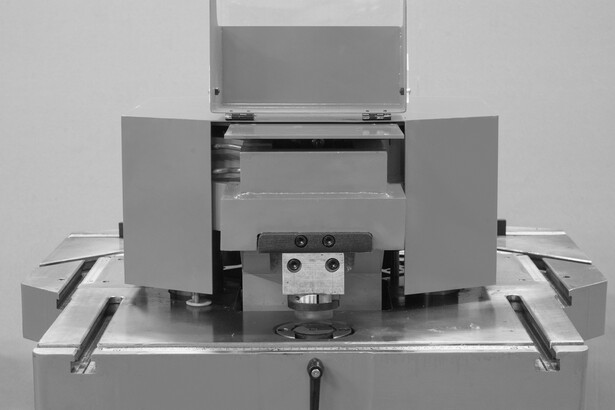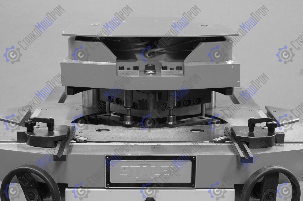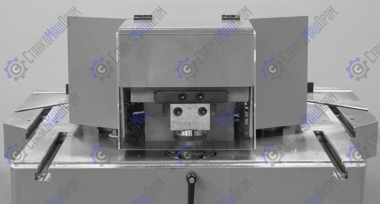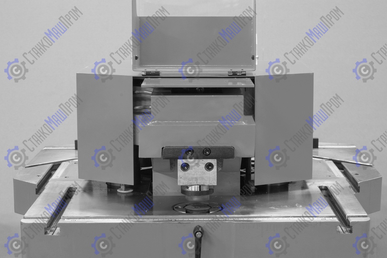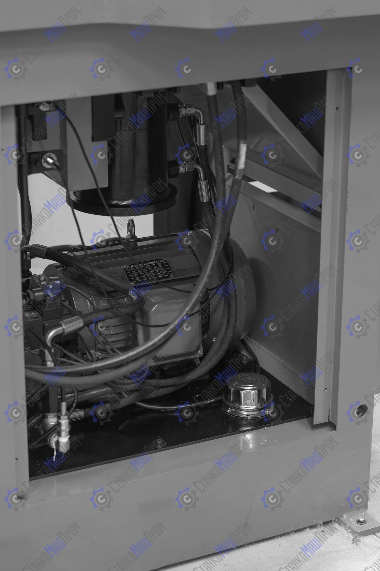 ![]() | Узел резки, два гидравлических прижима, направляющие для упора и фиксации заготовки под углом |