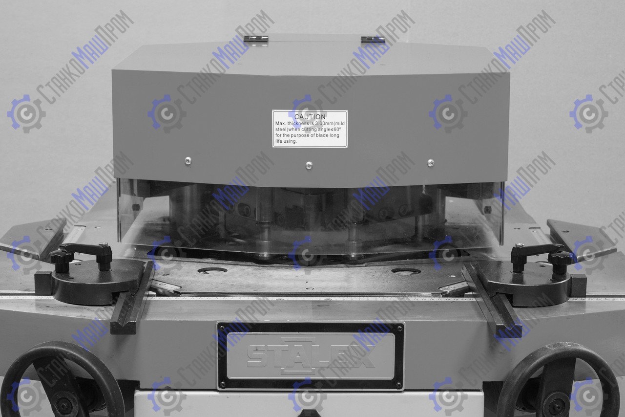 Особенности угловысечного станка Stalex HNM-6A - это мощное оборудование с гидравлическим приводом ножей для вырубки углов от 30° до 140° в листовом металле толщиной до 6 мм. Станок может работать в режиме гильотины и резать листы металла шириной до 200 мм. Процесс резки происходит за счёт работы гидроцилиндра, перемещающего узел по двум направляющим колоннам.