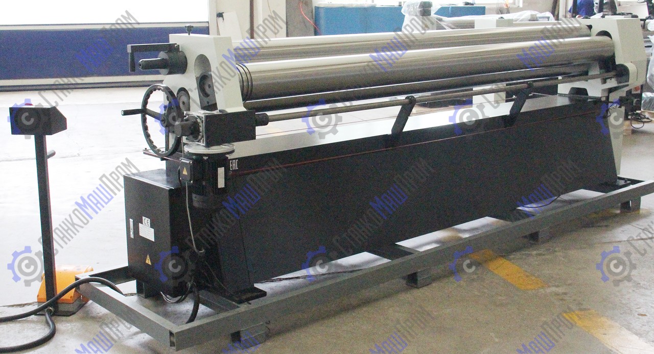 Вальцовочный станок предназначен для предания листу цилиндрической формы различного радиуса, данное оборудование широко применяется для изготовления комплектующих вентиляции, водосточного оборудования, в случаях производства цилиндрических и конических изделий, правке плоских заготовок, подгибке кромок. Выносная педаль дублируется пультом управления на станине станка. Цепная передача передаёт вращение с электродвигателя на валы. Верхний вал откидной, для легкого снятия готовых изделий. Откидной вал оснащен замком для предотвращения его самопроизвольного раскрытия в процессе работы.
