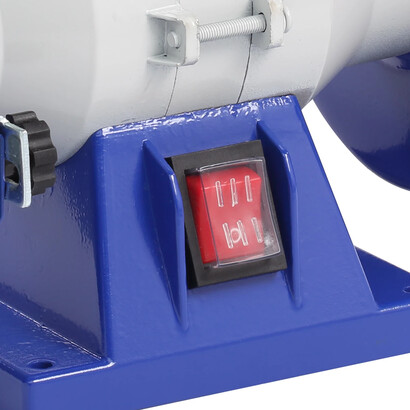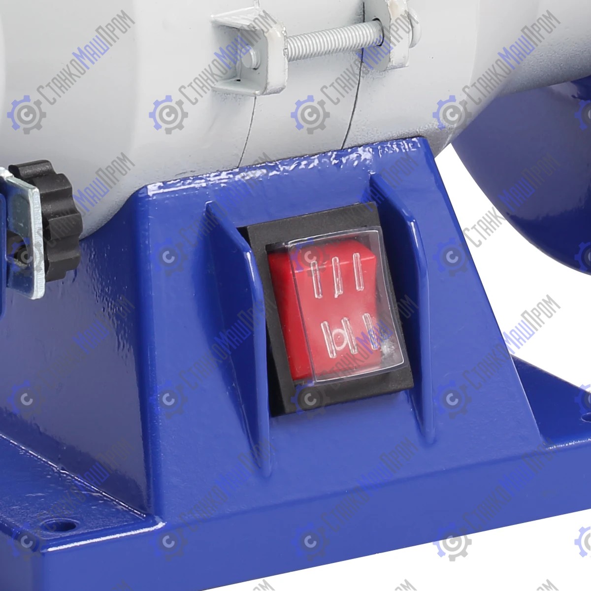 Оба диска оснащены регулируемыми рабочими упорами (подручниками), защитными кожухами (листовая сталь), искрозащитными экранами (поликарбонат).Основание станка алюминиевое, литое. На переднюю часть станины выведен выключатель в пылезащитном исполнении. Имеются 4 отверстия для крепления к верстаку.