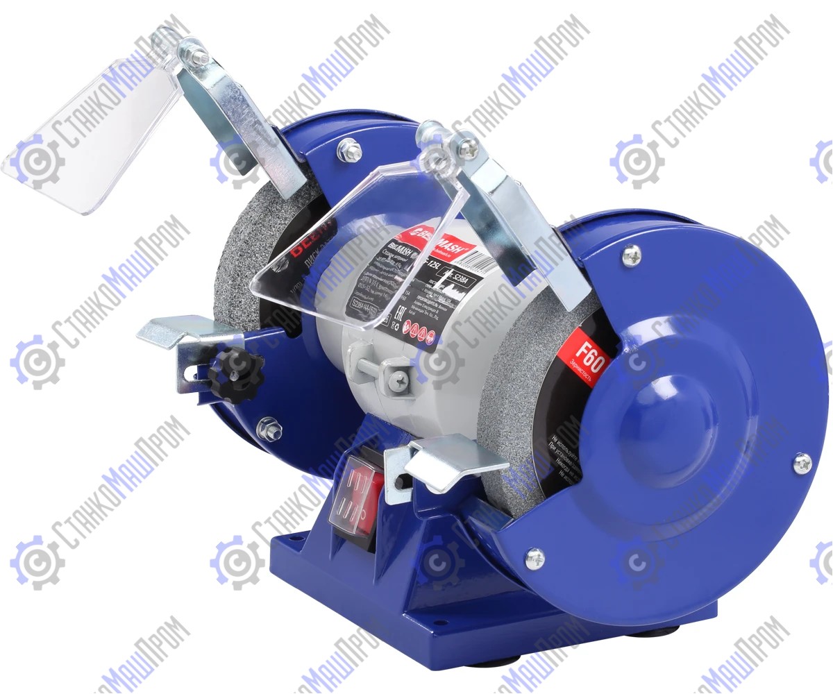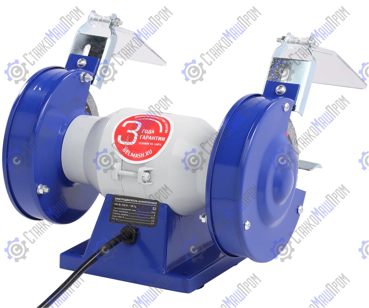 Это одна из самых компактных и легких моделей с традиционной компоновкой. По центру расположен асинхронный двигатель мощностью 200 Вт. По обе стороны от двигателя установлены заточные диски диаметром 125 мм и шириной 16 мм с различной зернистостью. Диски изготовлены из нормального электрокорунда (15А). Такой абразив используют для снятия заусенцев, фасок, обдирки на небольших заготовках, восстановления эксплуатационных свойств ручного инструмента, такого как ножи, топоры, секаторы и т. п